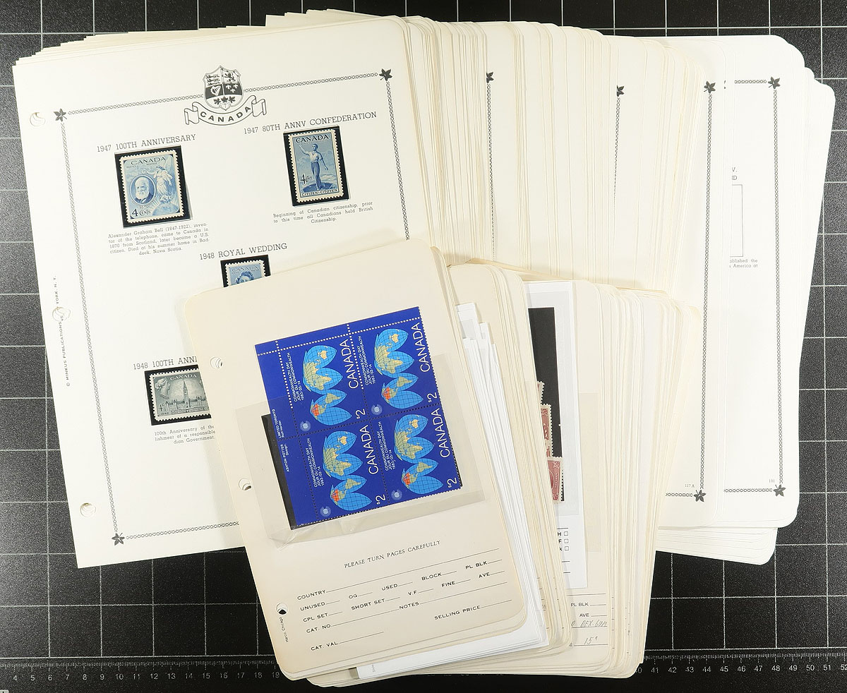 Collection of Mint Canada 1947-1976 mounted on Minkus brand pages (pages span 1947-1986) within a binder. Largely complete for the period, including better items such as QEII Karsh / Wilding coils, 50c Textile, $1.00 Totem (including "G" officials of the 50c Textile / $1.00 Totem). A spot check indicates that there is a mix of Never Hinged / Lightly Hinged throughout. This collection is nicely complimented by an envelope of "dealer cards" spanning from the 1930's to 1980's with mint Canada, with noted Centennials and $2.00 Commonwealth Day issues. Estimate =