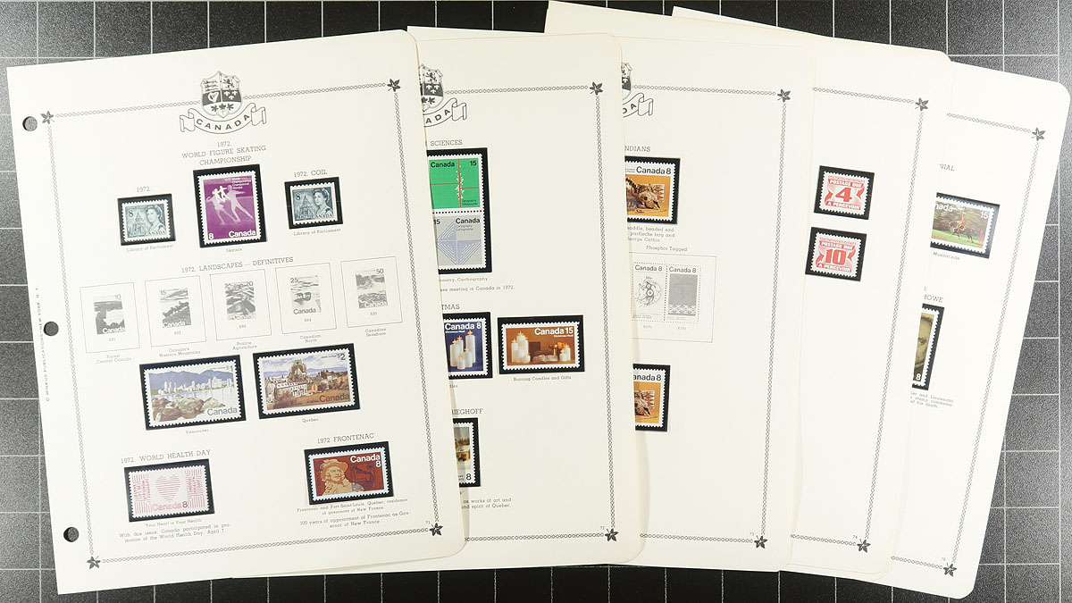 Collection of Mint Canada 1947-1976 mounted on Minkus brand pages (pages span 1947-1986) within a binder. Largely complete for the period, including better items such as QEII Karsh / Wilding coils, 50c Textile, $1.00 Totem (including "G" officials of the 50c Textile / $1.00 Totem). A spot check indicates that there is a mix of Never Hinged / Lightly Hinged throughout. This collection is nicely complimented by an envelope of "dealer cards" spanning from the 1930's to 1980's with mint Canada, with noted Centennials and $2.00 Commonwealth Day issues. Estimate =