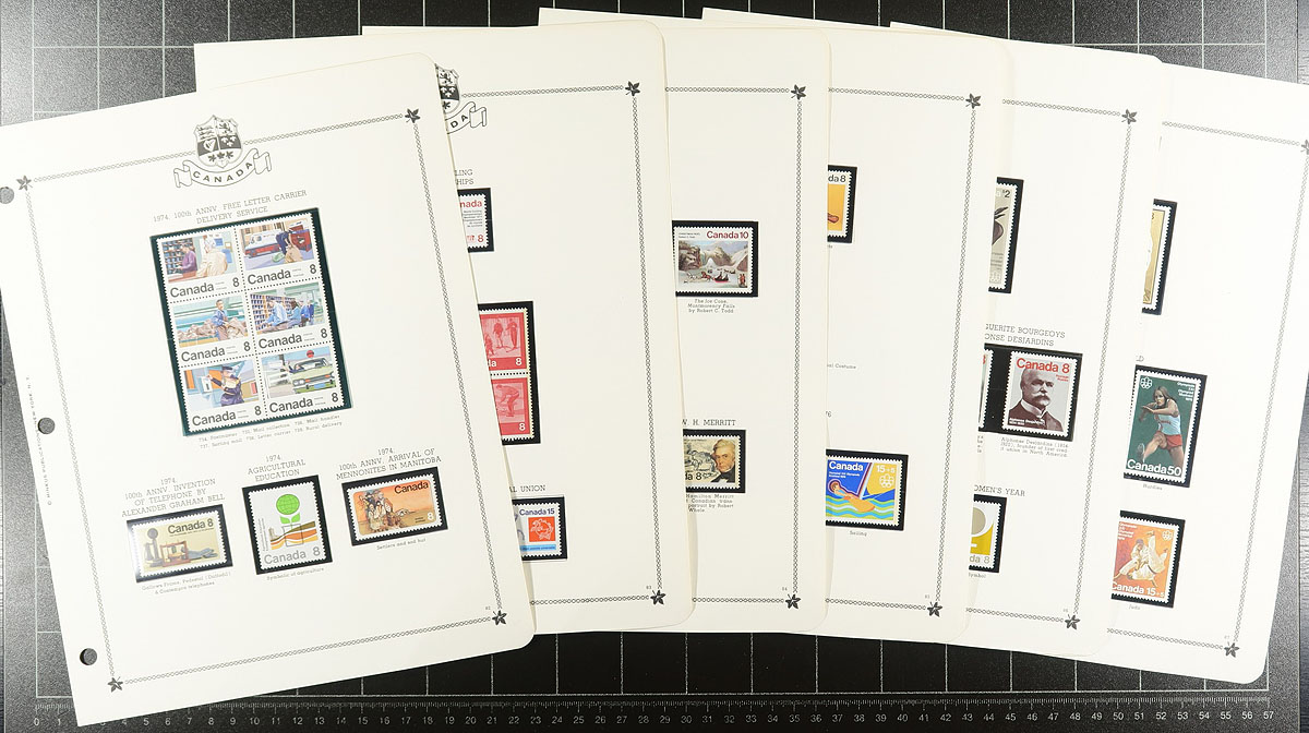 Collection of Mint Canada 1947-1976 mounted on Minkus brand pages (pages span 1947-1986) within a binder. Largely complete for the period, including better items such as QEII Karsh / Wilding coils, 50c Textile, $1.00 Totem (including "G" officials of the 50c Textile / $1.00 Totem). A spot check indicates that there is a mix of Never Hinged / Lightly Hinged throughout. This collection is nicely complimented by an envelope of "dealer cards" spanning from the 1930's to 1980's with mint Canada, with noted Centennials and $2.00 Commonwealth Day issues. Estimate =