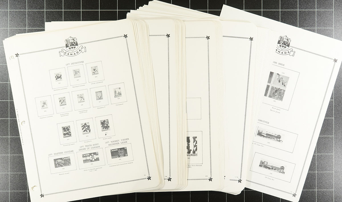 Collection of Mint Canada 1947-1976 mounted on Minkus brand pages (pages span 1947-1986) within a binder. Largely complete for the period, including better items such as QEII Karsh / Wilding coils, 50c Textile, $1.00 Totem (including "G" officials of the 50c Textile / $1.00 Totem). A spot check indicates that there is a mix of Never Hinged / Lightly Hinged throughout. This collection is nicely complimented by an envelope of "dealer cards" spanning from the 1930's to 1980's with mint Canada, with noted Centennials and $2.00 Commonwealth Day issues. Estimate =