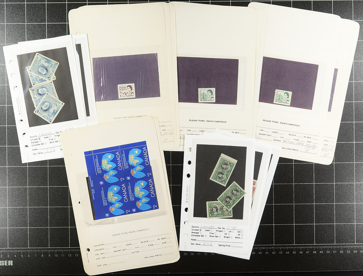 Collection of Mint Canada 1947-1976 mounted on Minkus brand pages (pages span 1947-1986) within a binder. Largely complete for the period, including better items such as QEII Karsh / Wilding coils, 50c Textile, $1.00 Totem (including "G" officials of the 50c Textile / $1.00 Totem). A spot check indicates that there is a mix of Never Hinged / Lightly Hinged throughout. This collection is nicely complimented by an envelope of "dealer cards" spanning from the 1930's to 1980's with mint Canada, with noted Centennials and $2.00 Commonwealth Day issues. Estimate =