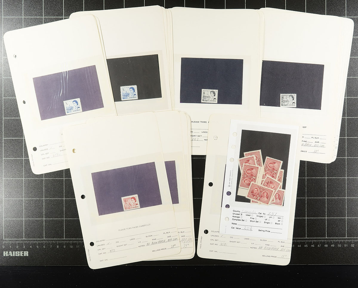 Collection of Mint Canada 1947-1976 mounted on Minkus brand pages (pages span 1947-1986) within a binder. Largely complete for the period, including better items such as QEII Karsh / Wilding coils, 50c Textile, $1.00 Totem (including "G" officials of the 50c Textile / $1.00 Totem). A spot check indicates that there is a mix of Never Hinged / Lightly Hinged throughout. This collection is nicely complimented by an envelope of "dealer cards" spanning from the 1930's to 1980's with mint Canada, with noted Centennials and $2.00 Commonwealth Day issues. Estimate =
