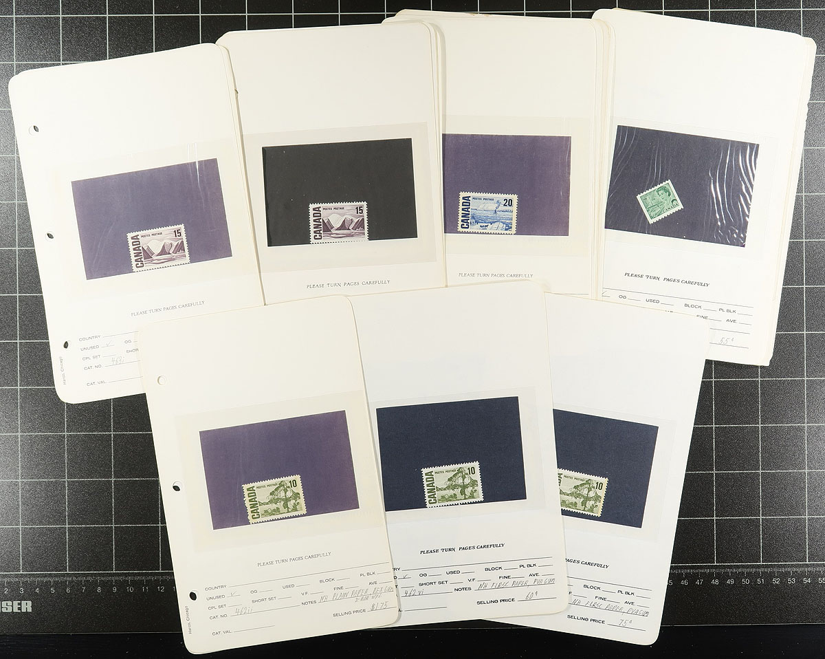 Collection of Mint Canada 1947-1976 mounted on Minkus brand pages (pages span 1947-1986) within a binder. Largely complete for the period, including better items such as QEII Karsh / Wilding coils, 50c Textile, $1.00 Totem (including "G" officials of the 50c Textile / $1.00 Totem). A spot check indicates that there is a mix of Never Hinged / Lightly Hinged throughout. This collection is nicely complimented by an envelope of "dealer cards" spanning from the 1930's to 1980's with mint Canada, with noted Centennials and $2.00 Commonwealth Day issues. Estimate =