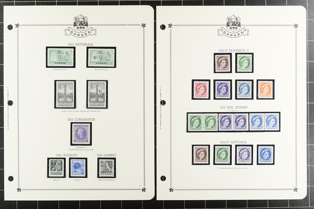 Collection of Mint Canada 1947-1976 mounted on Minkus brand pages (pages span 1947-1986) within a binder. Largely complete for the period, including better items such as QEII Karsh / Wilding coils, 50c Textile, $1.00 Totem (including "G" officials of the 50c Textile / $1.00 Totem). A spot check indicates that there is a mix of Never Hinged / Lightly Hinged throughout. This collection is nicely complimented by an envelope of "dealer cards" spanning from the 1930's to 1980's with mint Canada, with noted Centennials and $2.00 Commonwealth Day issues. Estimate =