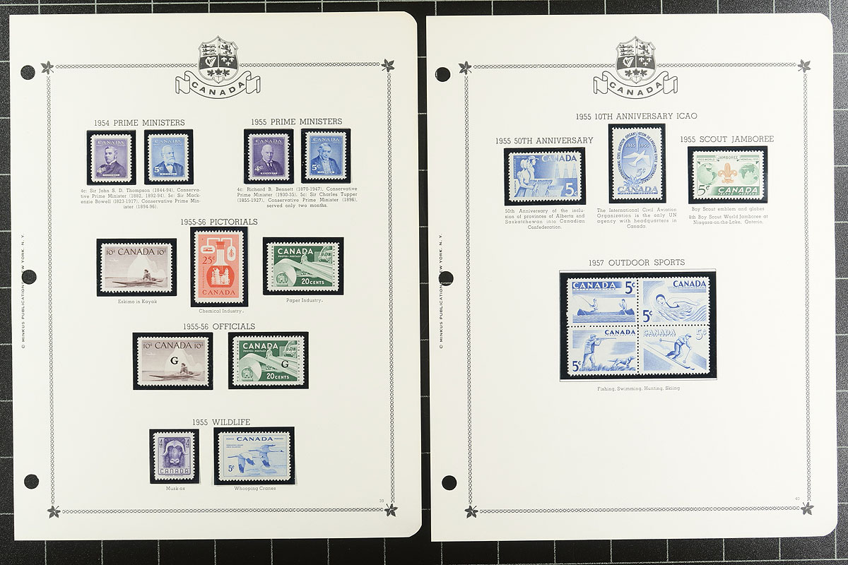 Collection of Mint Canada 1947-1976 mounted on Minkus brand pages (pages span 1947-1986) within a binder. Largely complete for the period, including better items such as QEII Karsh / Wilding coils, 50c Textile, $1.00 Totem (including "G" officials of the 50c Textile / $1.00 Totem). A spot check indicates that there is a mix of Never Hinged / Lightly Hinged throughout. This collection is nicely complimented by an envelope of "dealer cards" spanning from the 1930's to 1980's with mint Canada, with noted Centennials and $2.00 Commonwealth Day issues. Estimate =