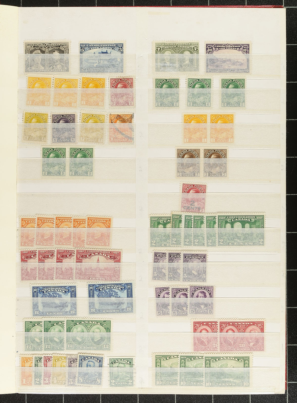 Mint and Used Stock 1908-1975. A red Unisafe 32-page stockbook, filled with a (mostly) mint and used stock of Canadian stamps, including several better items. Notable mint include 1908 Tercentenary 1/2c, 5c, 7c, 10c values (hinged, disturbed gum), a smattering of Admirals (including coils), 1927 Historical, GeoV "Scroll" and "Leaf", 1932 Medallion, 1933 Grain Exhibition OVPT (x2), 1935 Silver Jubilee, Geroge VI "War" and "Peace" and $1.00 Fisheries (x2). Used notables include $1.00 War (CDS), 1938 Chateau Ramezay (x2), 50c Grand Pre (x2) and $1.00 Edith Cavell. Often in matching mint/used combination for each issue. Expect the older material to be hinged, shifting to Never Hinged by the 1950's. The catalogue value here would add up very quickly! Well worth our estimated value. Estimate =