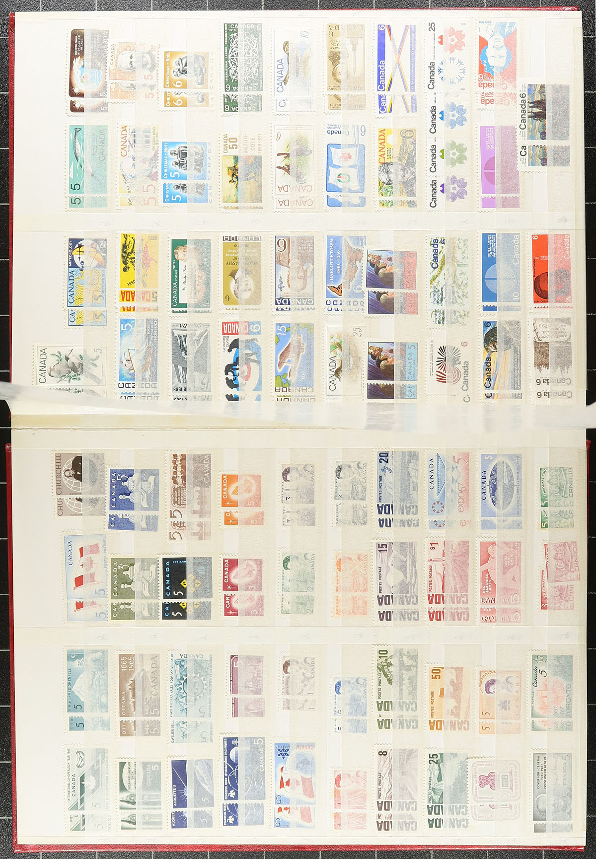 Mint and Used Stock 1908-1975. A red Unisafe 32-page stockbook, filled with a (mostly) mint and used stock of Canadian stamps, including several better items. Notable mint include 1908 Tercentenary 1/2c, 5c, 7c, 10c values (hinged, disturbed gum), a smattering of Admirals (including coils), 1927 Historical, GeoV "Scroll" and "Leaf", 1932 Medallion, 1933 Grain Exhibition OVPT (x2), 1935 Silver Jubilee, Geroge VI "War" and "Peace" and $1.00 Fisheries (x2). Used notables include $1.00 War (CDS), 1938 Chateau Ramezay (x2), 50c Grand Pre (x2) and $1.00 Edith Cavell. Often in matching mint/used combination for each issue. Expect the older material to be hinged, shifting to Never Hinged by the 1950's. The catalogue value here would add up very quickly! Well worth our estimated value. Estimate =