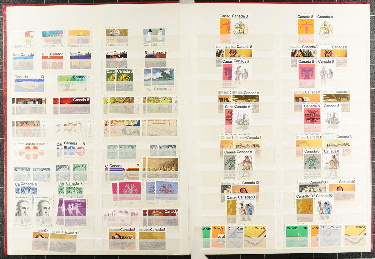 Mint and Used Stock 1908-1975. A red Unisafe 32-page stockbook, filled with a (mostly) mint and used stock of Canadian stamps, including several better items. Notable mint include 1908 Tercentenary 1/2c, 5c, 7c, 10c values (hinged, disturbed gum), a smattering of Admirals (including coils), 1927 Historical, GeoV "Scroll" and "Leaf", 1932 Medallion, 1933 Grain Exhibition OVPT (x2), 1935 Silver Jubilee, Geroge VI "War" and "Peace" and $1.00 Fisheries (x2). Used notables include $1.00 War (CDS), 1938 Chateau Ramezay (x2), 50c Grand Pre (x2) and $1.00 Edith Cavell. Often in matching mint/used combination for each issue. Expect the older material to be hinged, shifting to Never Hinged by the 1950's. The catalogue value here would add up very quickly! Well worth our estimated value. Estimate =
