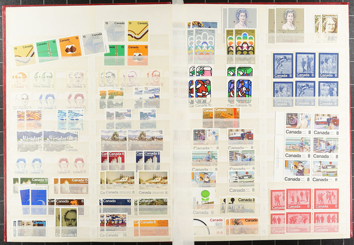 Mint and Used Stock 1908-1975. A red Unisafe 32-page stockbook, filled with a (mostly) mint and used stock of Canadian stamps, including several better items. Notable mint include 1908 Tercentenary 1/2c, 5c, 7c, 10c values (hinged, disturbed gum), a smattering of Admirals (including coils), 1927 Historical, GeoV "Scroll" and "Leaf", 1932 Medallion, 1933 Grain Exhibition OVPT (x2), 1935 Silver Jubilee, Geroge VI "War" and "Peace" and $1.00 Fisheries (x2). Used notables include $1.00 War (CDS), 1938 Chateau Ramezay (x2), 50c Grand Pre (x2) and $1.00 Edith Cavell. Often in matching mint/used combination for each issue. Expect the older material to be hinged, shifting to Never Hinged by the 1950's. The catalogue value here would add up very quickly! Well worth our estimated value. Estimate =