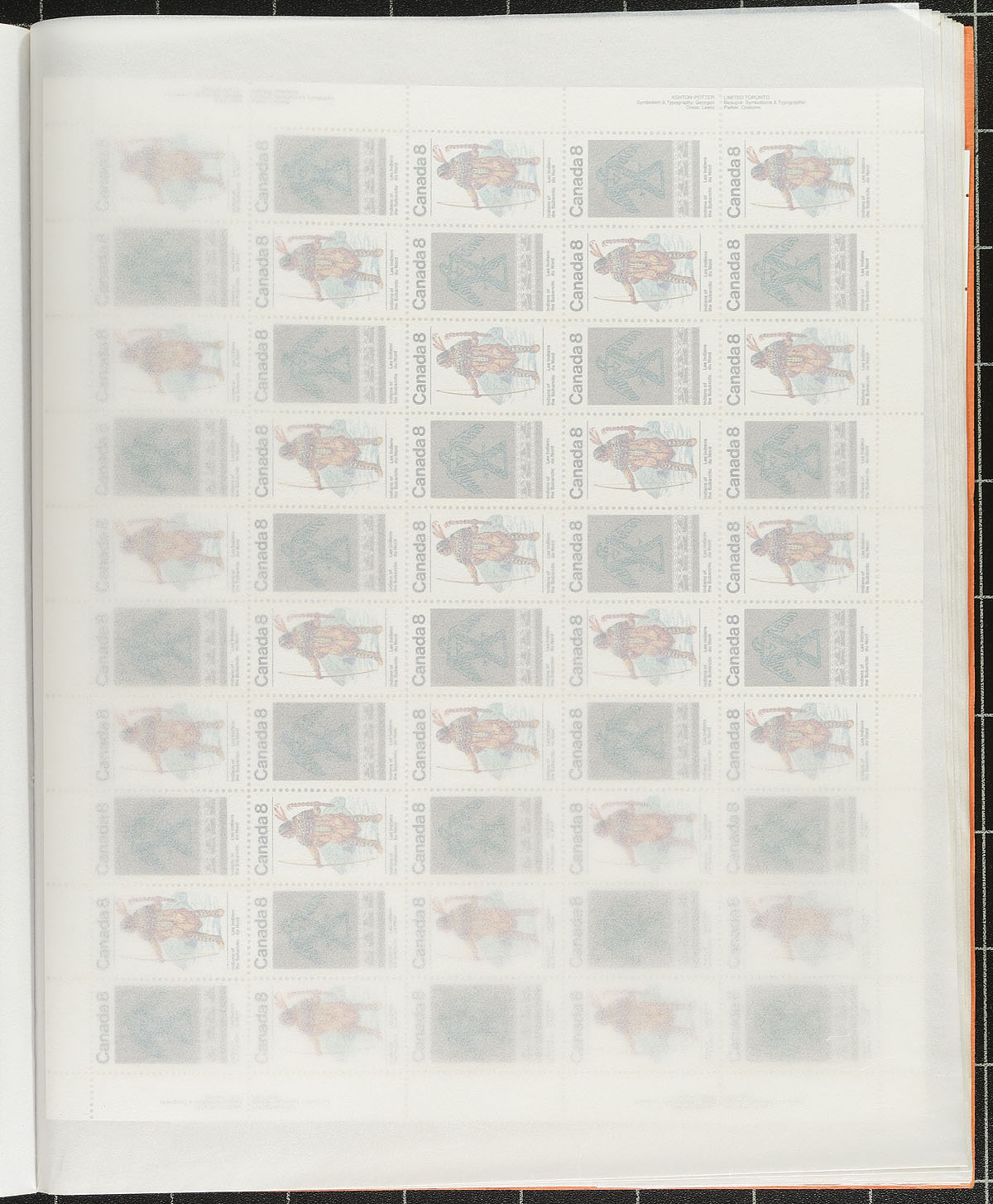 Orange sheet file containing full panes of early 1950's through 1970's period commemoratives, including the 1953 Canada Goose, Provincial flowers issues, Canadian ships, 1973 Royal Visit, First Nations se-tenants and more. Conservatively valued as face value postage only. Total Face value =