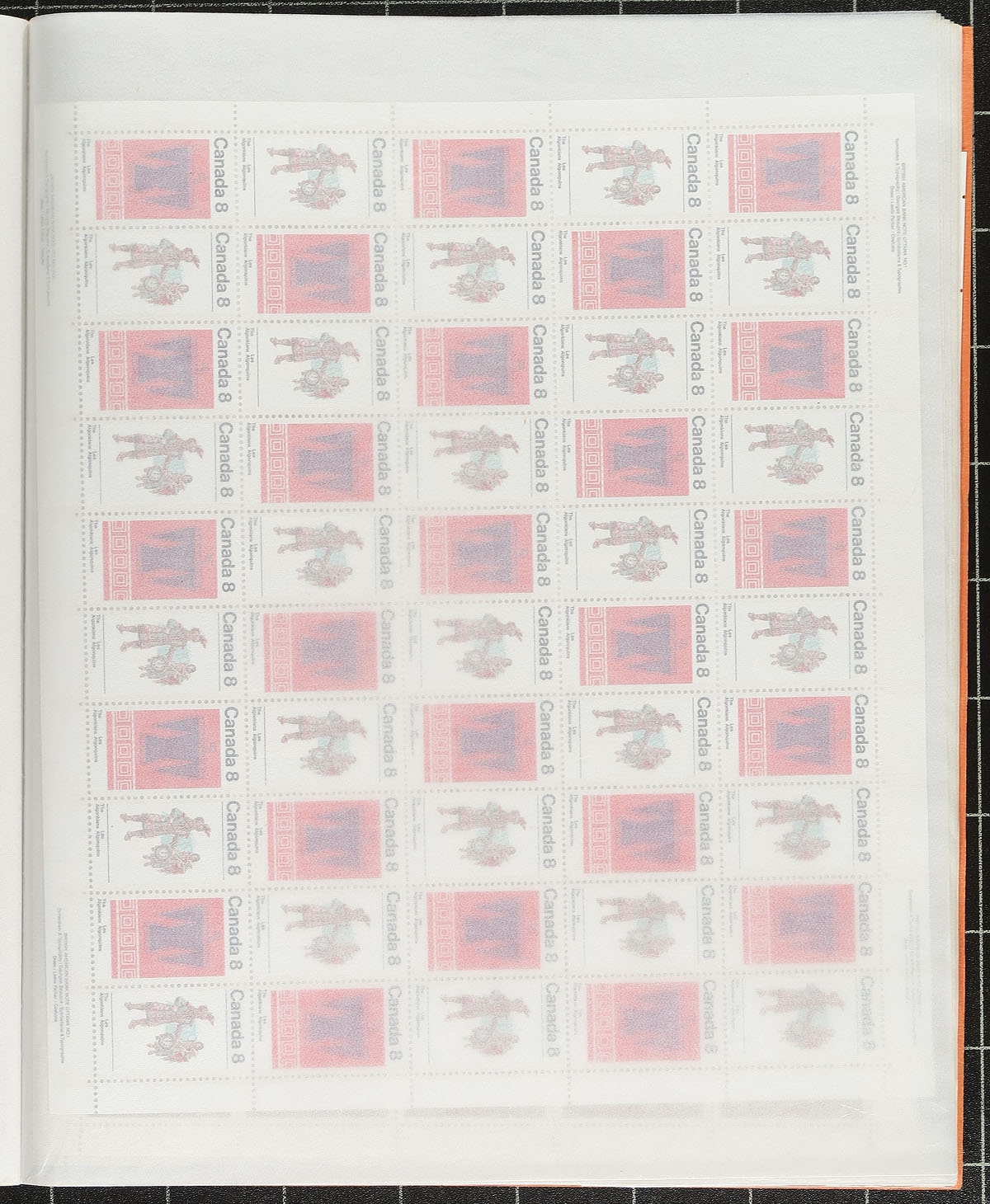Orange sheet file containing full panes of early 1950's through 1970's period commemoratives, including the 1953 Canada Goose, Provincial flowers issues, Canadian ships, 1973 Royal Visit, First Nations se-tenants and more. Conservatively valued as face value postage only. Total Face value =