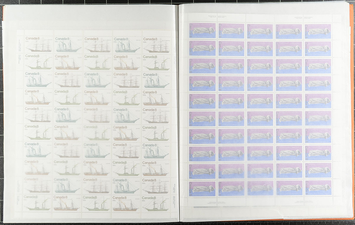 Orange sheet file containing full panes of early 1950's through 1970's period commemoratives, including the 1953 Canada Goose, Provincial flowers issues, Canadian ships, 1973 Royal Visit, First Nations se-tenants and more. Conservatively valued as face value postage only. Total Face value =