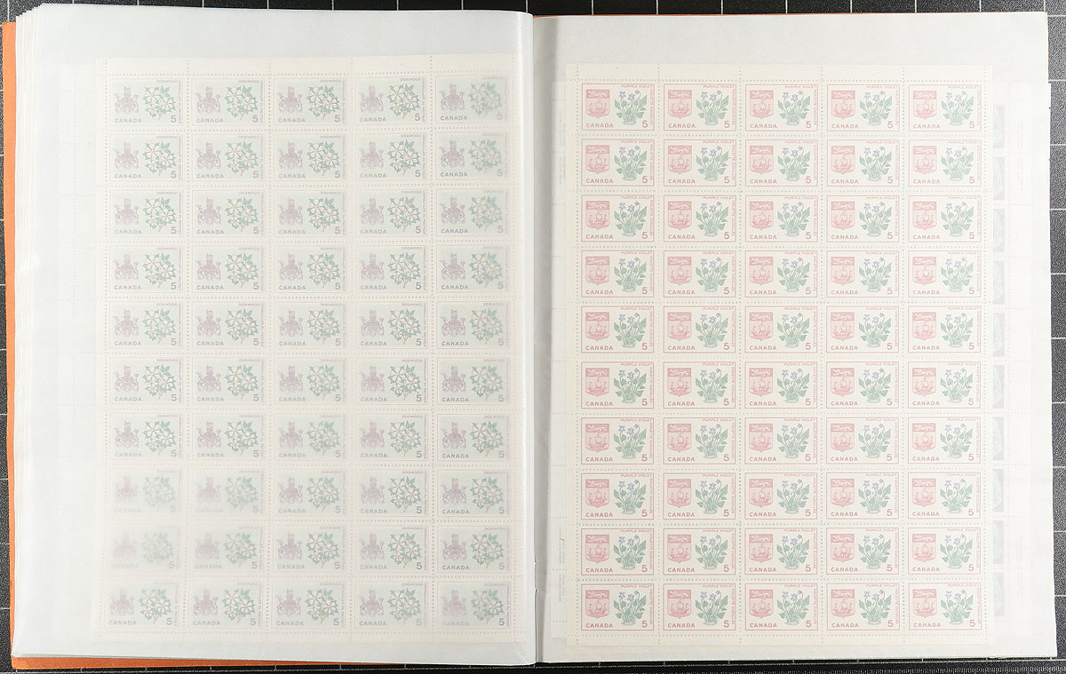 Orange sheet file containing full panes of early 1950's through 1970's period commemoratives, including the 1953 Canada Goose, Provincial flowers issues, Canadian ships, 1973 Royal Visit, First Nations se-tenants and more. Conservatively valued as face value postage only. Total Face value =