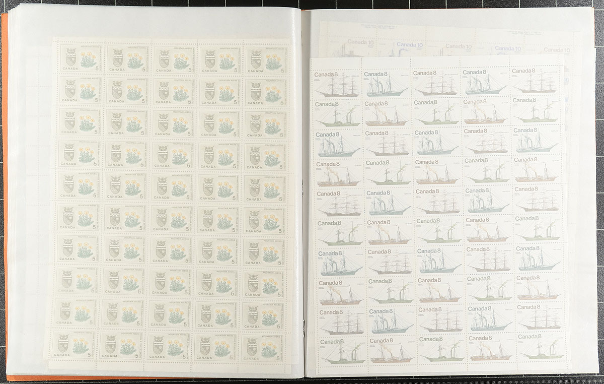 Orange sheet file containing full panes of early 1950's through 1970's period commemoratives, including the 1953 Canada Goose, Provincial flowers issues, Canadian ships, 1973 Royal Visit, First Nations se-tenants and more. Conservatively valued as face value postage only. Total Face value =