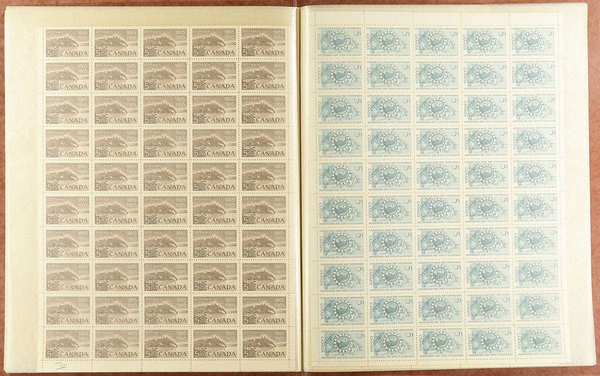 Mint Sheet Madness! A trio of mint sheet files, filled with a wide-array of mint sheets, partial sheets, Newfoundland a smattering of used multiples! Primarily from the early QEII to 1970's period, but also noted a few earlier including a 1934 New Brunswick block of 40 stamps, with Plate No.1 inscription (UL) and Newfoundland sheets for the 1947 Cabot, 1c Codfish (x2), 7c Queen Mother Mary. Other notable sheets include 1957 UPU Congress (15c), Provincial Flowers, QEII Karsh, Earth Sciences etc. Very conservatively valued for the face value alone, but certainly worth more. Inspect the photos of the lot to appreciate the scope and value. Total face value =