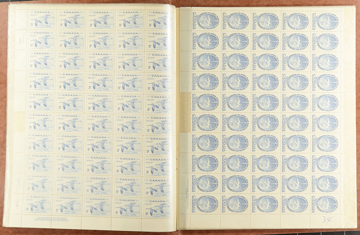 Mint Sheet Madness! A trio of mint sheet files, filled with a wide-array of mint sheets, partial sheets, Newfoundland a smattering of used multiples! Primarily from the early QEII to 1970's period, but also noted a few earlier including a 1934 New Brunswick block of 40 stamps, with Plate No.1 inscription (UL) and Newfoundland sheets for the 1947 Cabot, 1c Codfish (x2), 7c Queen Mother Mary. Other notable sheets include 1957 UPU Congress (15c), Provincial Flowers, QEII Karsh, Earth Sciences etc. Very conservatively valued for the face value alone, but certainly worth more. Inspect the photos of the lot to appreciate the scope and value. Total face value =