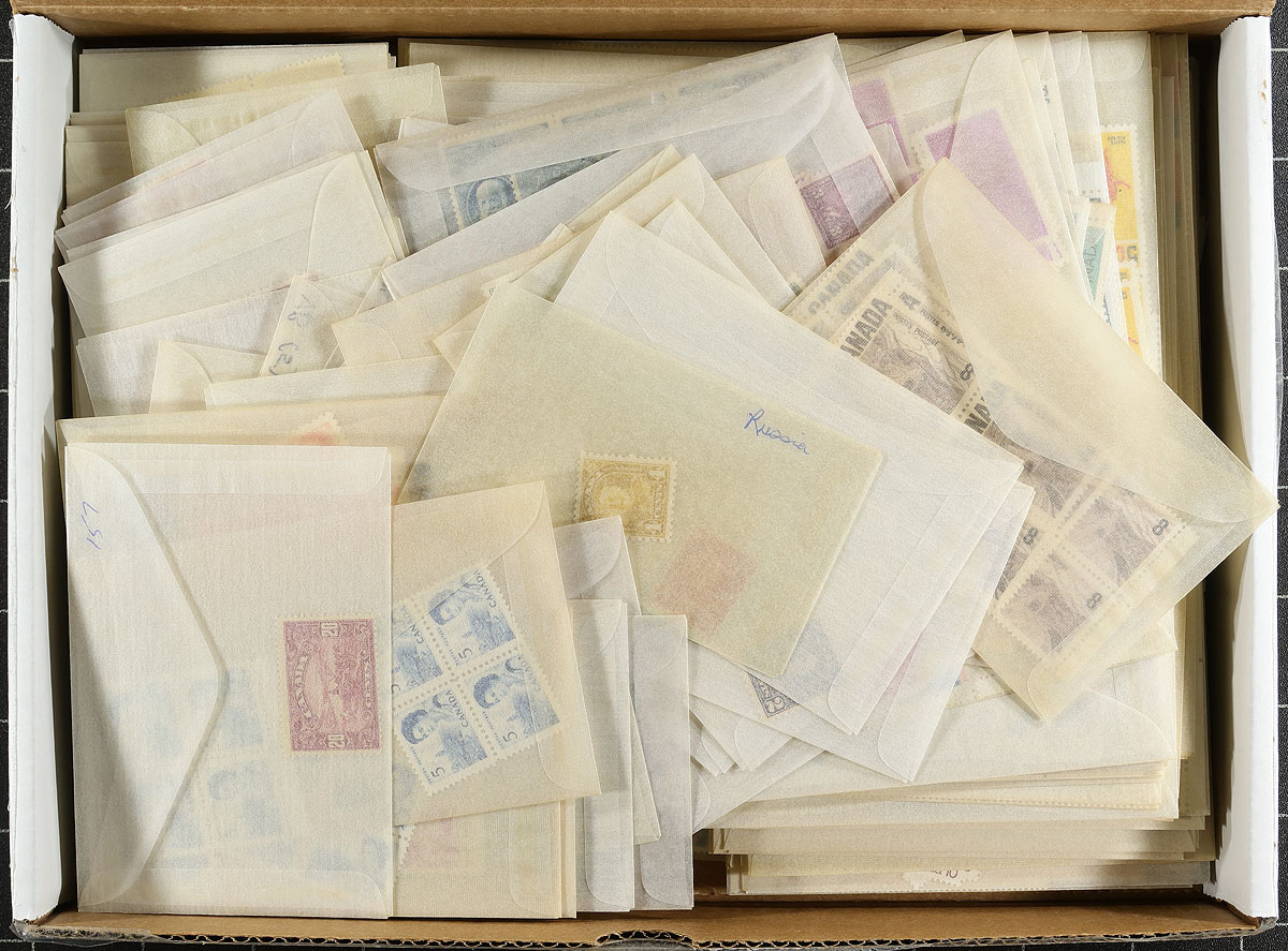 Mint Packet Palooza. A small box containing glassine packages of mint stamps from the late 1920's to early 1970's including "Back of the Book" Officials, Airmails, Postage Dues etc. Easily a few hundred glassines here, holding several hundred stamps, with notable earlier George V material including "Scroll", "Leaf/Arch" etc. Expect the earliest material to be Hinged, but largely a Never Hinged offering. The catalogue value would add up quickly here! A perfect "sorter" lot, unchecked for paper varieties that are abundant in the early QEII period. Estimate =