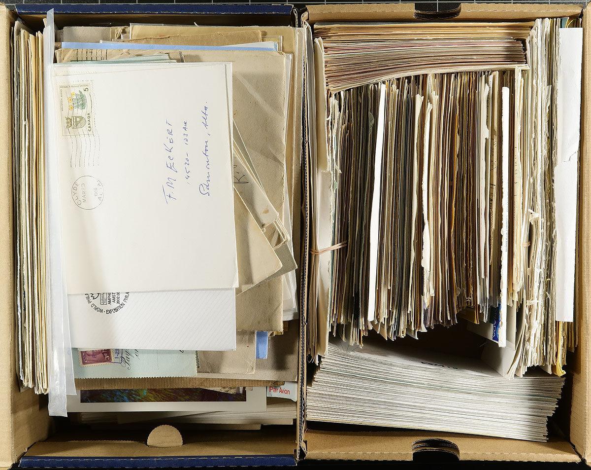 A pair of shoeboxes, filled with a wild-ride of Canadian Postal History, from Small Queens to QEII and everything in-between. The first shoebox contains a mix of material, the majority of which were selected for a purpose, some with obvious value (like a 6c Small Queen, single use paying the double rate), while others are more subtle (like the "Stik n Tic" and 36c Plum QEII used in-period) and a strength in the George V era, with many nice illustrated corner cards / advertising. The second shoebox is a study of the (largely) the Klussendorf machine cancel of the 1980's / 1990's. Easily several hundred items here, which will prove both an enjoyable and rewarding sort. Estimate =