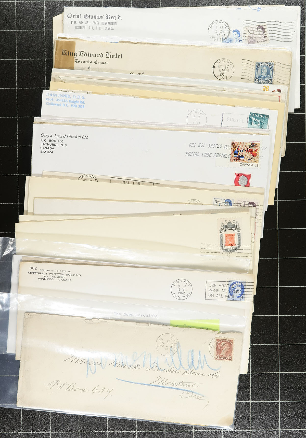 A pair of shoeboxes, filled with a wild-ride of Canadian Postal History, from Small Queens to QEII and everything in-between. The first shoebox contains a mix of material, the majority of which were selected for a purpose, some with obvious value (like a 6c Small Queen, single use paying the double rate), while others are more subtle (like the "Stik n Tic" and 36c Plum QEII used in-period) and a strength in the George V era, with many nice illustrated corner cards / advertising. The second shoebox is a study of the (largely) the Klussendorf machine cancel of the 1980's / 1990's. Easily several hundred items here, which will prove both an enjoyable and rewarding sort. Estimate =