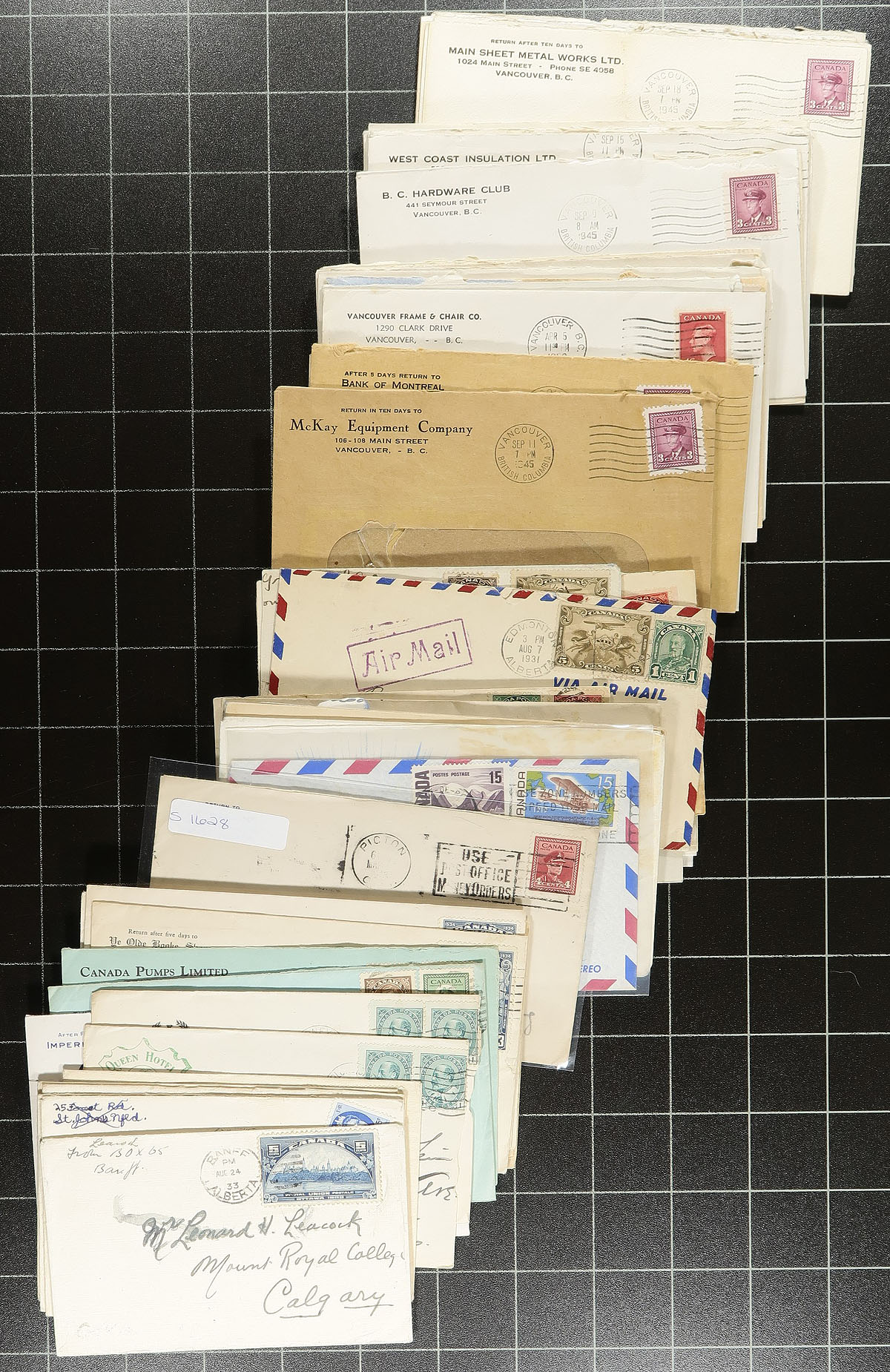 A pair of shoeboxes, filled with a wild-ride of Canadian Postal History, from Small Queens to QEII and everything in-between. The first shoebox contains a mix of material, the majority of which were selected for a purpose, some with obvious value (like a 6c Small Queen, single use paying the double rate), while others are more subtle (like the "Stik n Tic" and 36c Plum QEII used in-period) and a strength in the George V era, with many nice illustrated corner cards / advertising. The second shoebox is a study of the (largely) the Klussendorf machine cancel of the 1980's / 1990's. Easily several hundred items here, which will prove both an enjoyable and rewarding sort. Estimate =