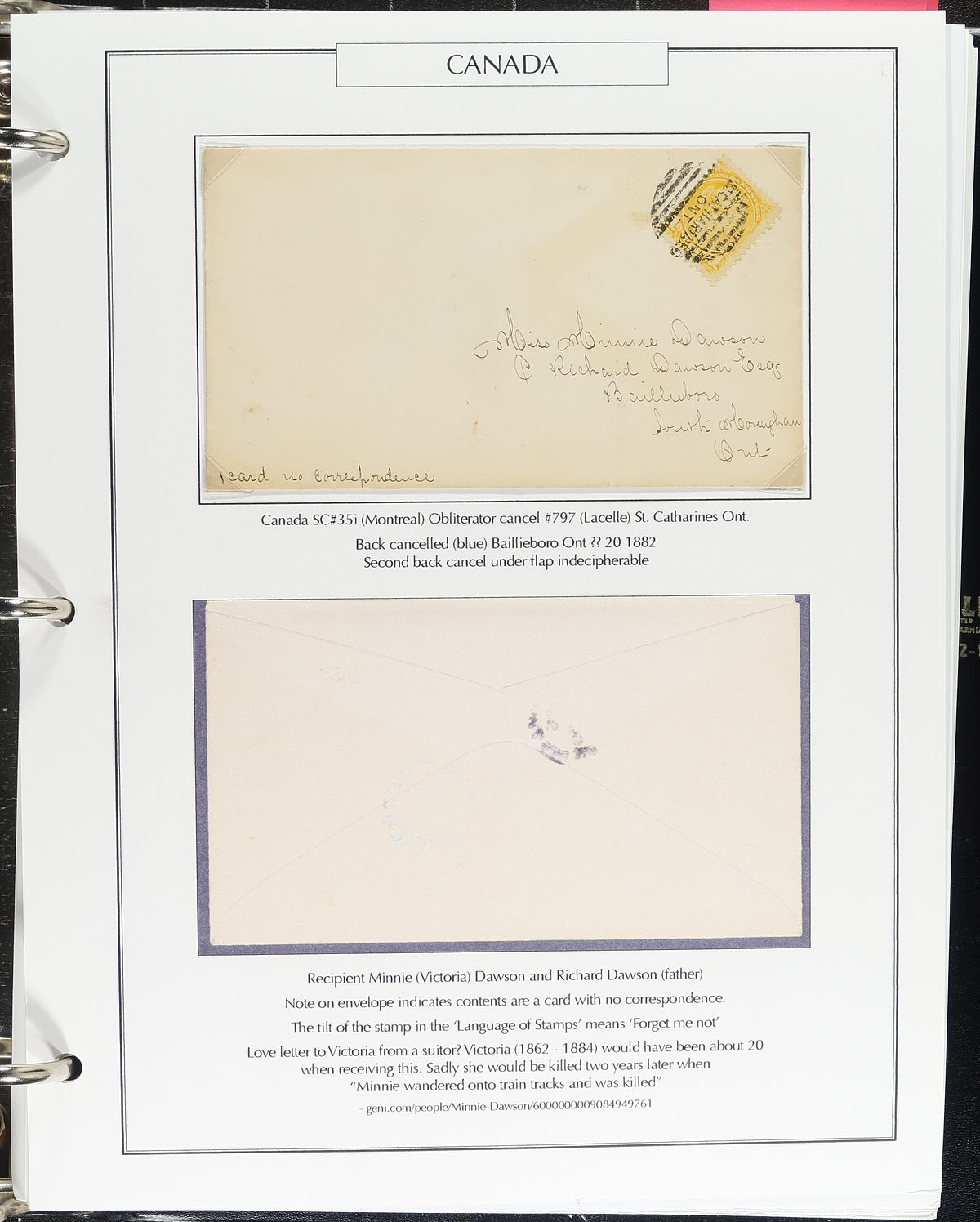 Extensively researched as assembled (on computer generated pages, in 3 binders) collection of over 190 covers and postcards, from QV to QEII. A real range of material here, some of which has obvious value, others which may seem more mundane at first glance, but have all be chosen to tell a philatelic story by the previous owner. Noted Small Queens, Postal Stationery, Advertising, Registered, Postmarks, RPPC (Real Photo Postcards) etc. The pictures show some of the better items, and overall this group will prove rewarding for any postal historian. Estimate =