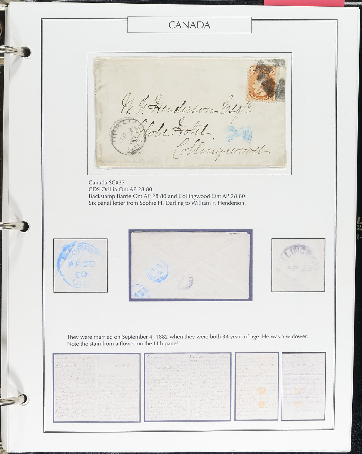 Extensively researched as assembled (on computer generated pages, in 3 binders) collection of over 190 covers and postcards, from QV to QEII. A real range of material here, some of which has obvious value, others which may seem more mundane at first glance, but have all be chosen to tell a philatelic story by the previous owner. Noted Small Queens, Postal Stationery, Advertising, Registered, Postmarks, RPPC (Real Photo Postcards) etc. The pictures show some of the better items, and overall this group will prove rewarding for any postal historian. Estimate =