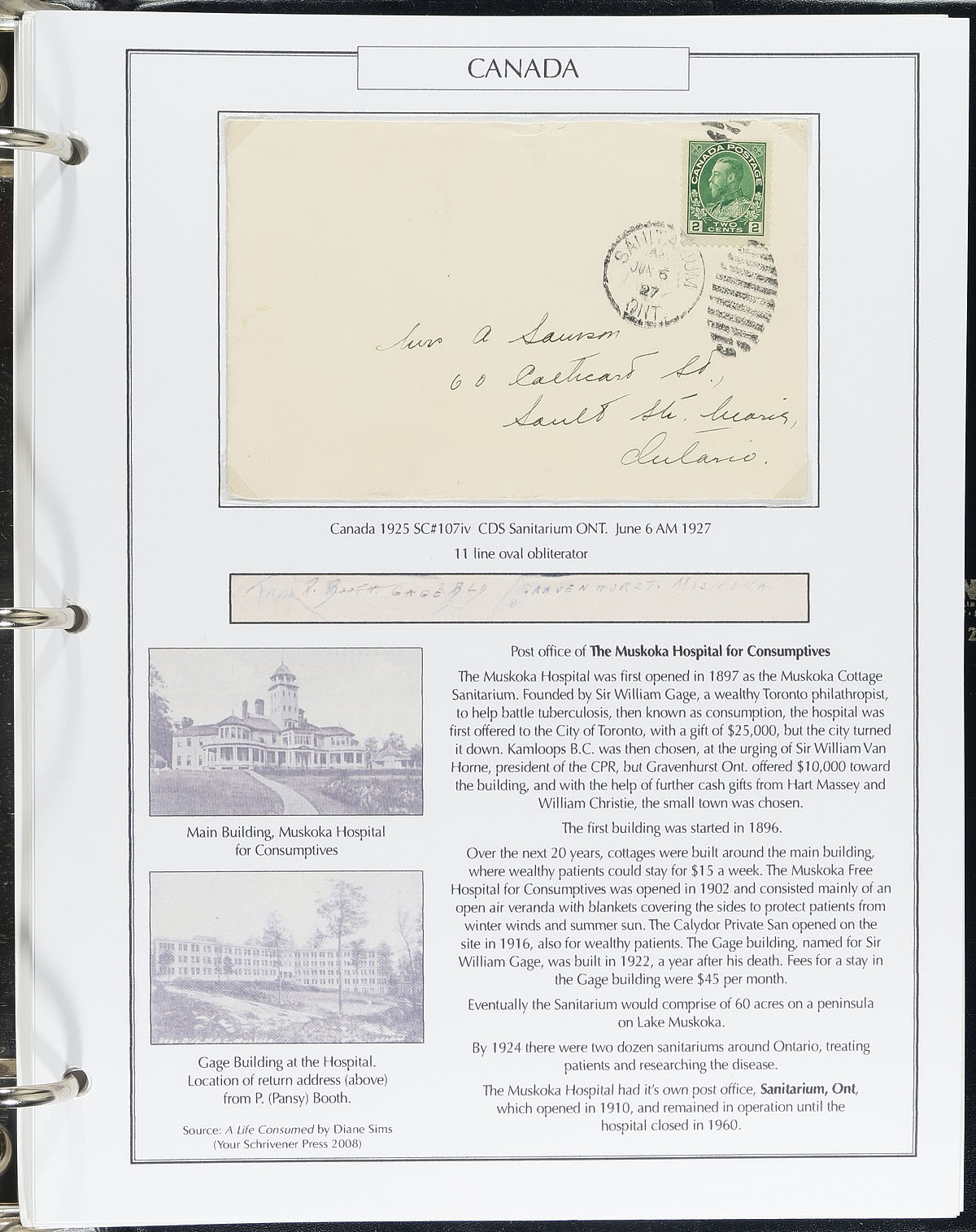Extensively researched as assembled (on computer generated pages, in 3 binders) collection of over 190 covers and postcards, from QV to QEII. A real range of material here, some of which has obvious value, others which may seem more mundane at first glance, but have all be chosen to tell a philatelic story by the previous owner. Noted Small Queens, Postal Stationery, Advertising, Registered, Postmarks, RPPC (Real Photo Postcards) etc. The pictures show some of the better items, and overall this group will prove rewarding for any postal historian. Estimate =