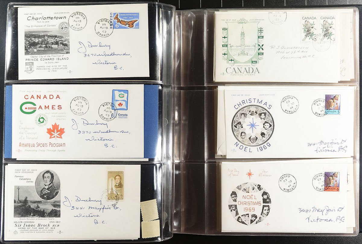 First Day Covers. A four binder holding of both private cachet, no cachet and Canada Post Office cachet FDC, from the 1940's to 1970's. A few hundred items here, including better 1950's/1960's private cachets. Also included is a smattering foreign covers. While a bit hard grasp in images, the value of this lot will come to light once sorted. Estimate =