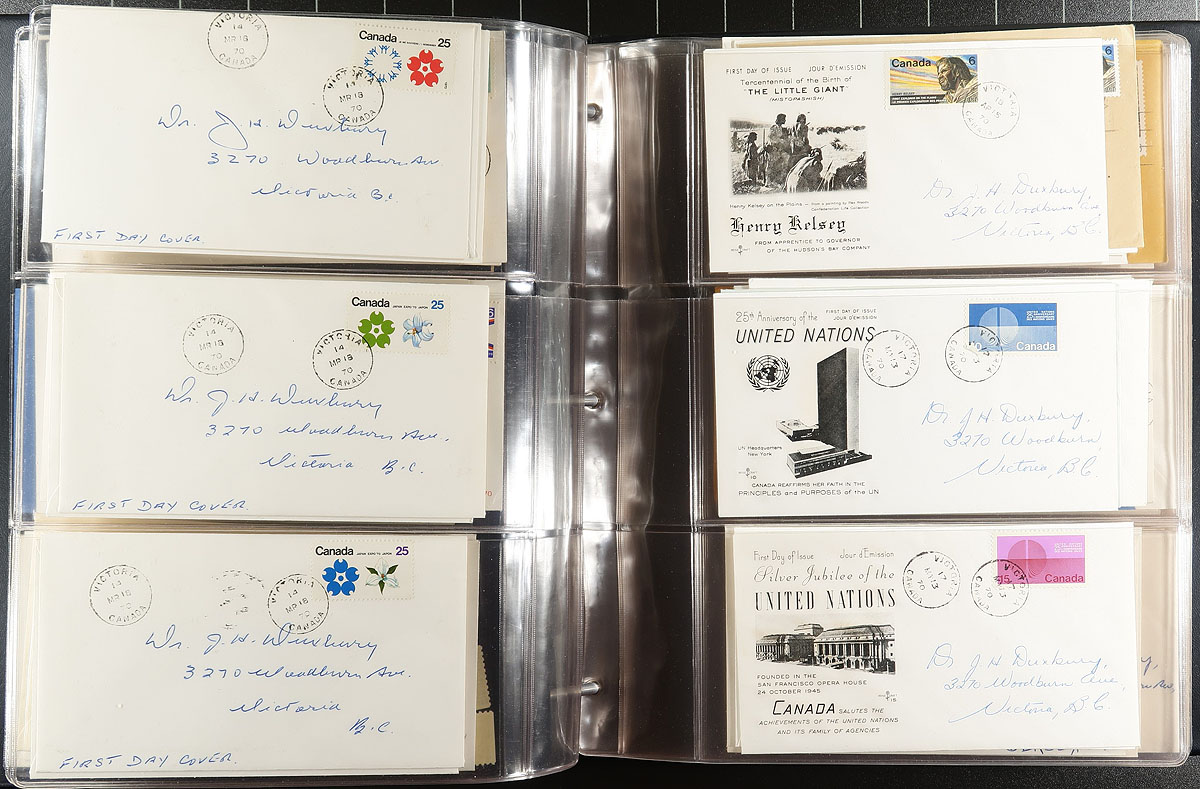 First Day Covers. A four binder holding of both private cachet, no cachet and Canada Post Office cachet FDC, from the 1940's to 1970's. A few hundred items here, including better 1950's/1960's private cachets. Also included is a smattering foreign covers. While a bit hard grasp in images, the value of this lot will come to light once sorted. Estimate =