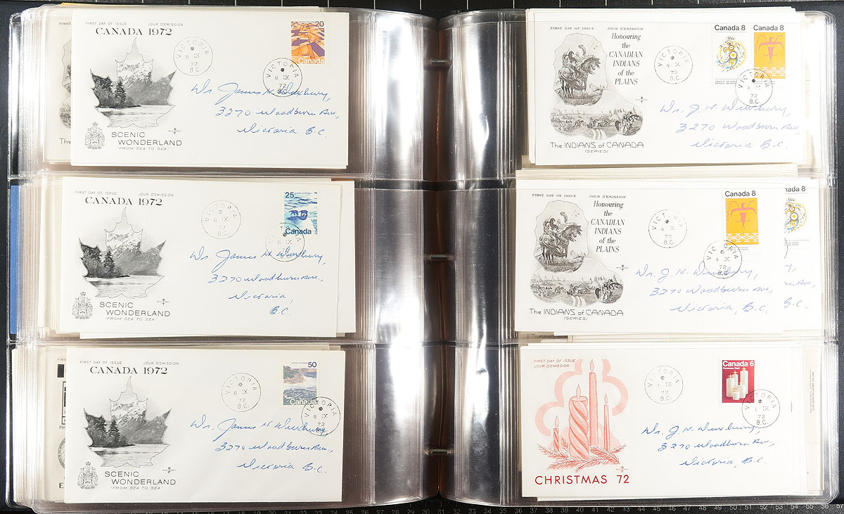 First Day Covers. A four binder holding of both private cachet, no cachet and Canada Post Office cachet FDC, from the 1940's to 1970's. A few hundred items here, including better 1950's/1960's private cachets. Also included is a smattering foreign covers. While a bit hard grasp in images, the value of this lot will come to light once sorted. Estimate =