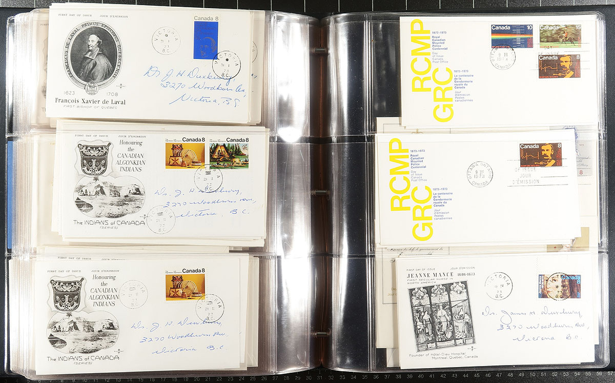 First Day Covers. A four binder holding of both private cachet, no cachet and Canada Post Office cachet FDC, from the 1940's to 1970's. A few hundred items here, including better 1950's/1960's private cachets. Also included is a smattering foreign covers. While a bit hard grasp in images, the value of this lot will come to light once sorted. Estimate =