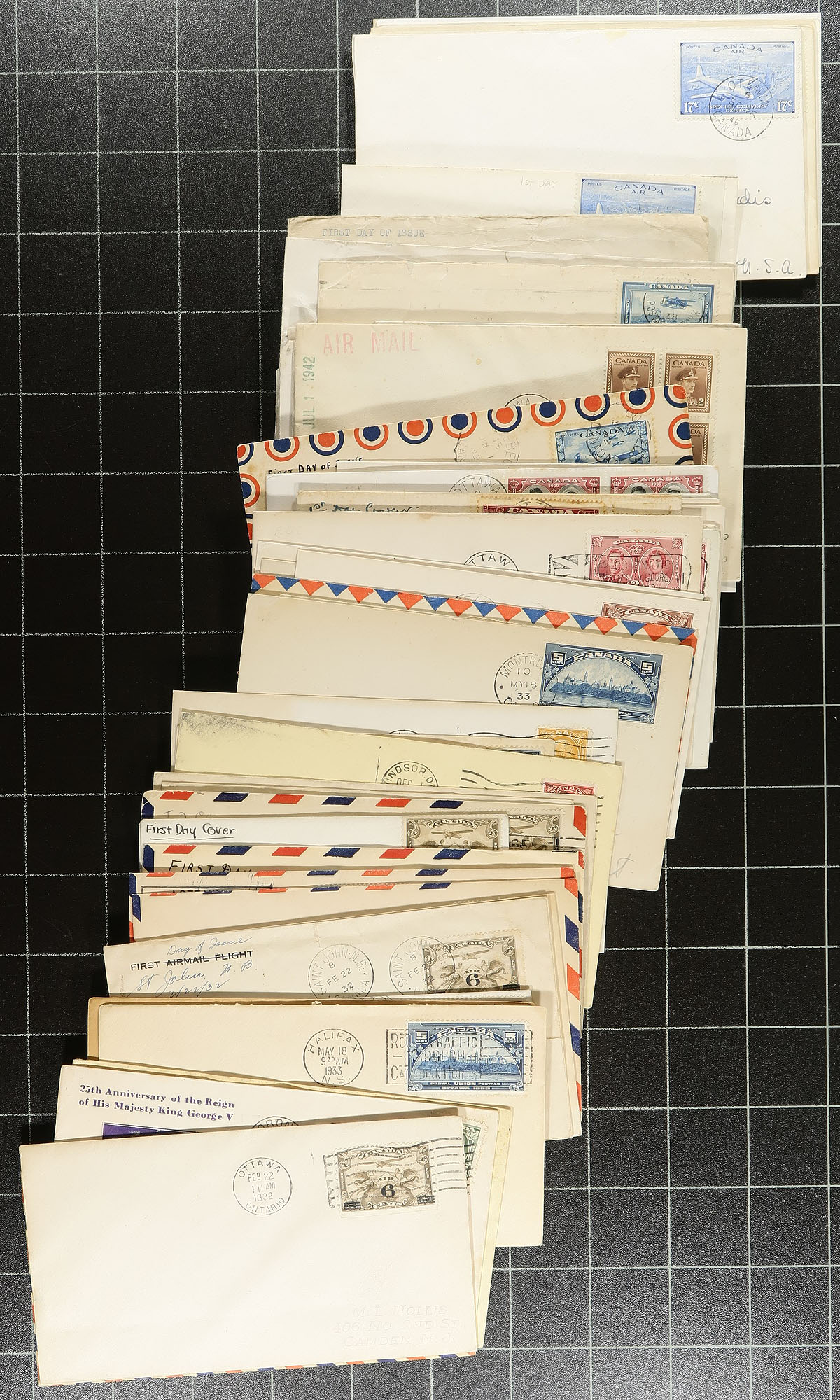 First Day Covers. A shoebox of early FDC 1932-1980, with about 300 items in total, including better private cachets (most of all these FDC are pre-Canada Post issued FDC), and better frankings / stamps / registered etc. Some of the notable include various George V, "Back of the Book" airmail issues, a "handful" of 1935 Silver Jubilee issue 1c Princess Elizabeth and lots of commemorative issues. A great batch to sort through. Estimate =