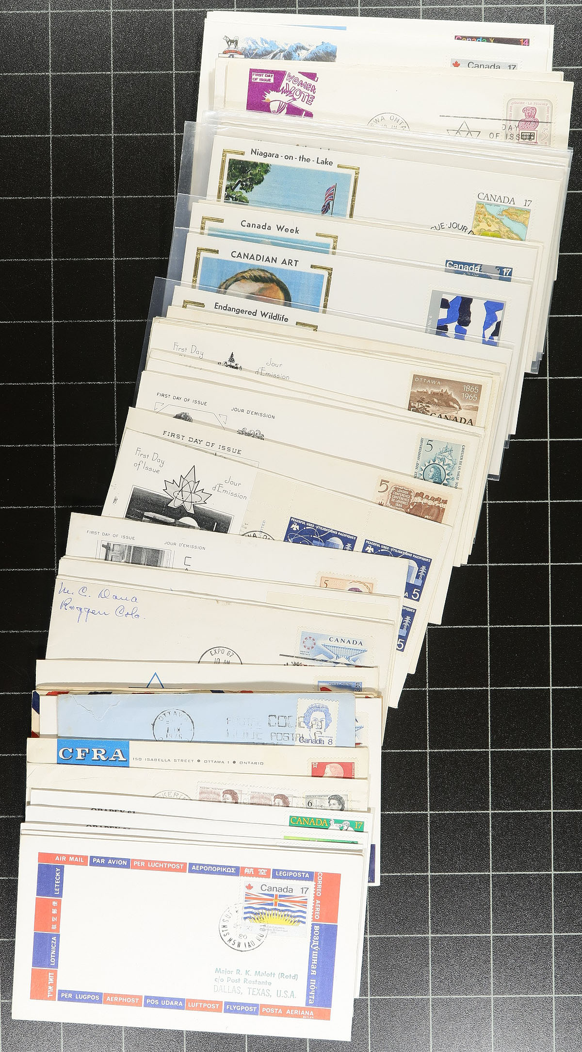 First Day Covers. A shoebox of early FDC 1932-1980, with about 300 items in total, including better private cachets (most of all these FDC are pre-Canada Post issued FDC), and better frankings / stamps / registered etc. Some of the notable include various George V, "Back of the Book" airmail issues, a "handful" of 1935 Silver Jubilee issue 1c Princess Elizabeth and lots of commemorative issues. A great batch to sort through. Estimate =