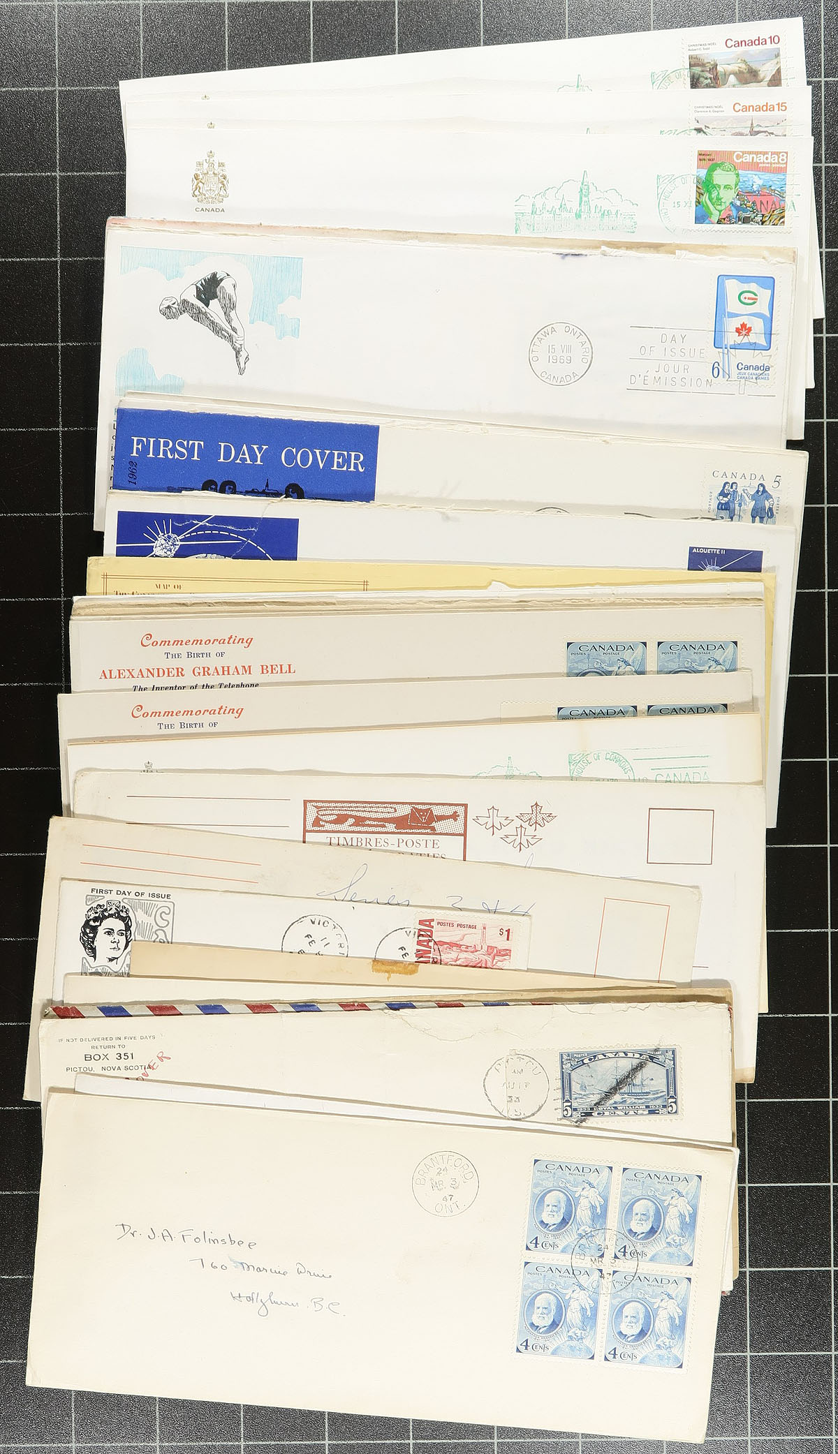 First Day Covers. An extra-large shoebox of roughly 500 First Day Covers from the 1930's to 1980's including with a mix of private cachet / no cachet and Canada Post cachet. Of particular note is a batch of late 1960's / early 1970's House of Commons FDC, with matching cachet / turquoise meter postmarks. Easily worth our estimated value. Estimate =