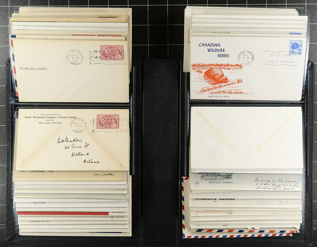 First Day Covers. A group of First Day Covers 1932-1957 neatly arranged in a "White Ace" cover album (amazingly still in the original box). Several better noted including George VI "Postes / Postage" set in blocks, JCR cachets, 50c Textile, 1937 Coronation, 1939 Royal Visit etc. There are even some "blank" holders if you wish to keep this album alive. About 80 items in total. Estimate =