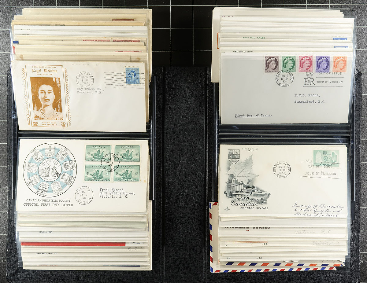 First Day Covers. A group of First Day Covers 1932-1957 neatly arranged in a "White Ace" cover album (amazingly still in the original box). Several better noted including George VI "Postes / Postage" set in blocks, JCR cachets, 50c Textile, 1937 Coronation, 1939 Royal Visit etc. There are even some "blank" holders if you wish to keep this album alive. About 80 items in total. Estimate =