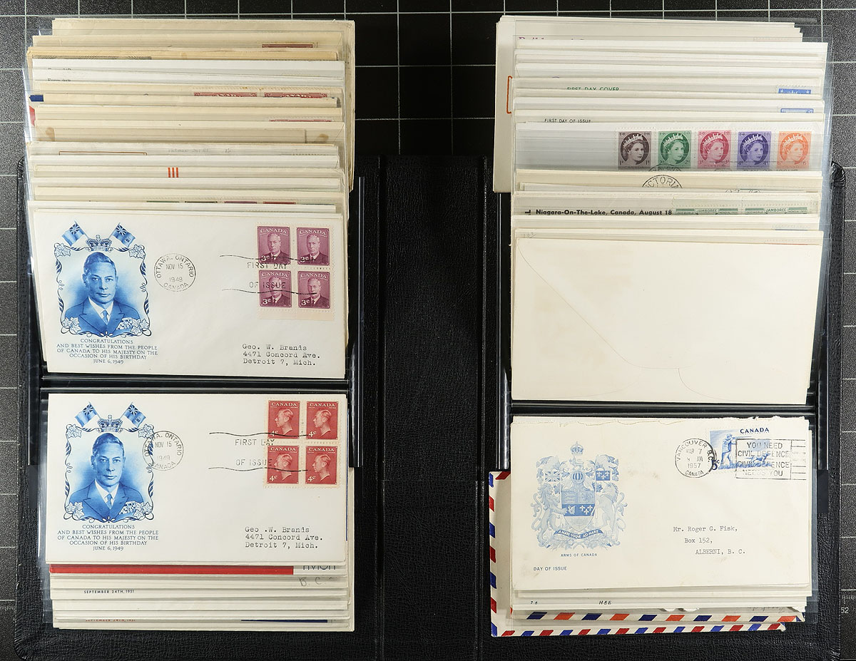 First Day Covers. A group of First Day Covers 1932-1957 neatly arranged in a "White Ace" cover album (amazingly still in the original box). Several better noted including George VI "Postes / Postage" set in blocks, JCR cachets, 50c Textile, 1937 Coronation, 1939 Royal Visit etc. There are even some "blank" holders if you wish to keep this album alive. About 80 items in total. Estimate =
