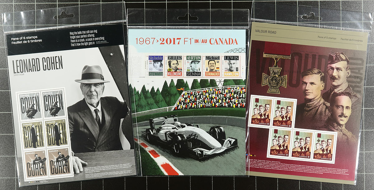 Balance of consignment offering of "odds and ends" with plenty of better items to satisfy any collector. Includes (in no particular order). 1) Used blocks, with about 40 blocks George VI to QEII including 1946 issued $1.00 Train Ferry /1953 issued $1.00 Totem. 2) "Hockey Cards" series stamps, with 18 issues ($2.50 values x 12, $1.80 values x6) with a total face value of $40.80 alone. 3) A couple of stockpages of Wildlife Conservation Stamp booklets 1985, 1986 x2, 1988, 1990, 1990, 1991 x2, 1993, 1994, 1995, 1996. 4) Modern Post Office "P" stamp miniature panes in Post Office sealed packs x5. 5) Thematic Collections x6 including Luner New Years, Historic Land Vehicles, Gilles Villeneuve etc. Lots of value here. Estimate =
