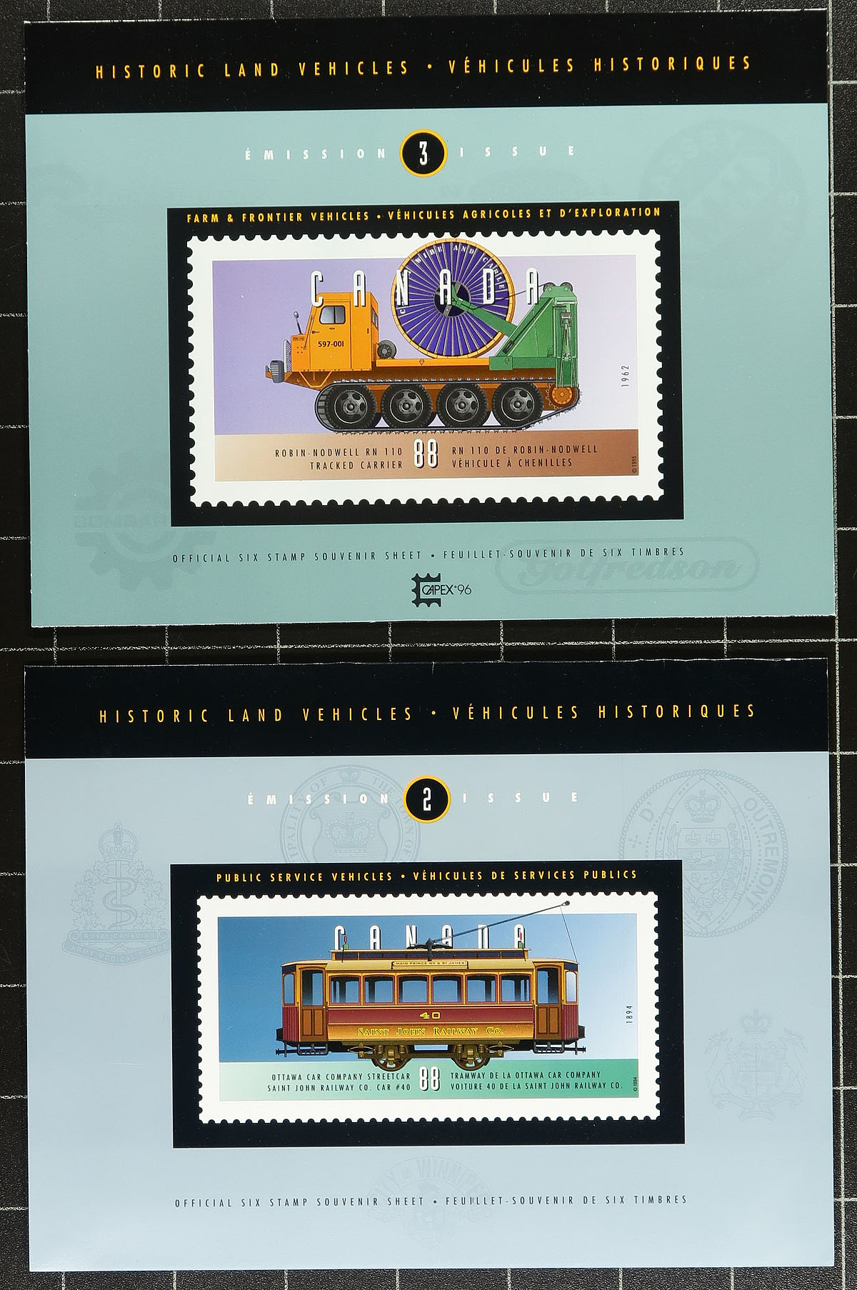 Balance of consignment offering of "odds and ends" with plenty of better items to satisfy any collector. Includes (in no particular order). 1) Used blocks, with about 40 blocks George VI to QEII including 1946 issued $1.00 Train Ferry /1953 issued $1.00 Totem. 2) "Hockey Cards" series stamps, with 18 issues ($2.50 values x 12, $1.80 values x6) with a total face value of $40.80 alone. 3) A couple of stockpages of Wildlife Conservation Stamp booklets 1985, 1986 x2, 1988, 1990, 1990, 1991 x2, 1993, 1994, 1995, 1996. 4) Modern Post Office "P" stamp miniature panes in Post Office sealed packs x5. 5) Thematic Collections x6 including Luner New Years, Historic Land Vehicles, Gilles Villeneuve etc. Lots of value here. Estimate =