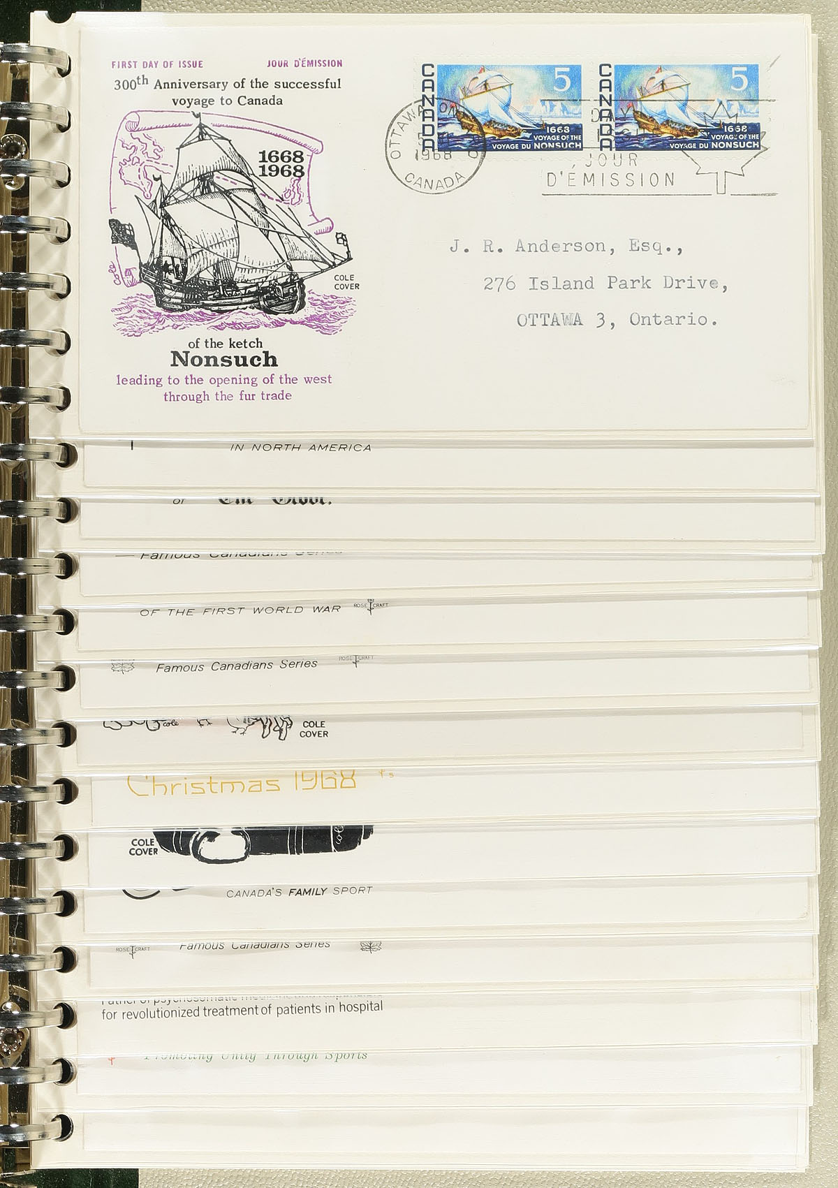 First Day Covers. A box of cover albums (x5) containing a collection of First Day Covers from the 1930's to 1980's. The bulk of the value is in three matching FDC albums (still in original boxes) with small format covers, being primarily private cachet covers (but also some non-cachet, and early small-format Canada Post issued), in which we noted a complete set of mid/high-value QEII Centennials. These three albums are complimented by a Unisafe FDC album with mostly Canada Post issued FDC and a small FDC album with Canada/ Foreign FDC. About 400 covers in total. Estimate =