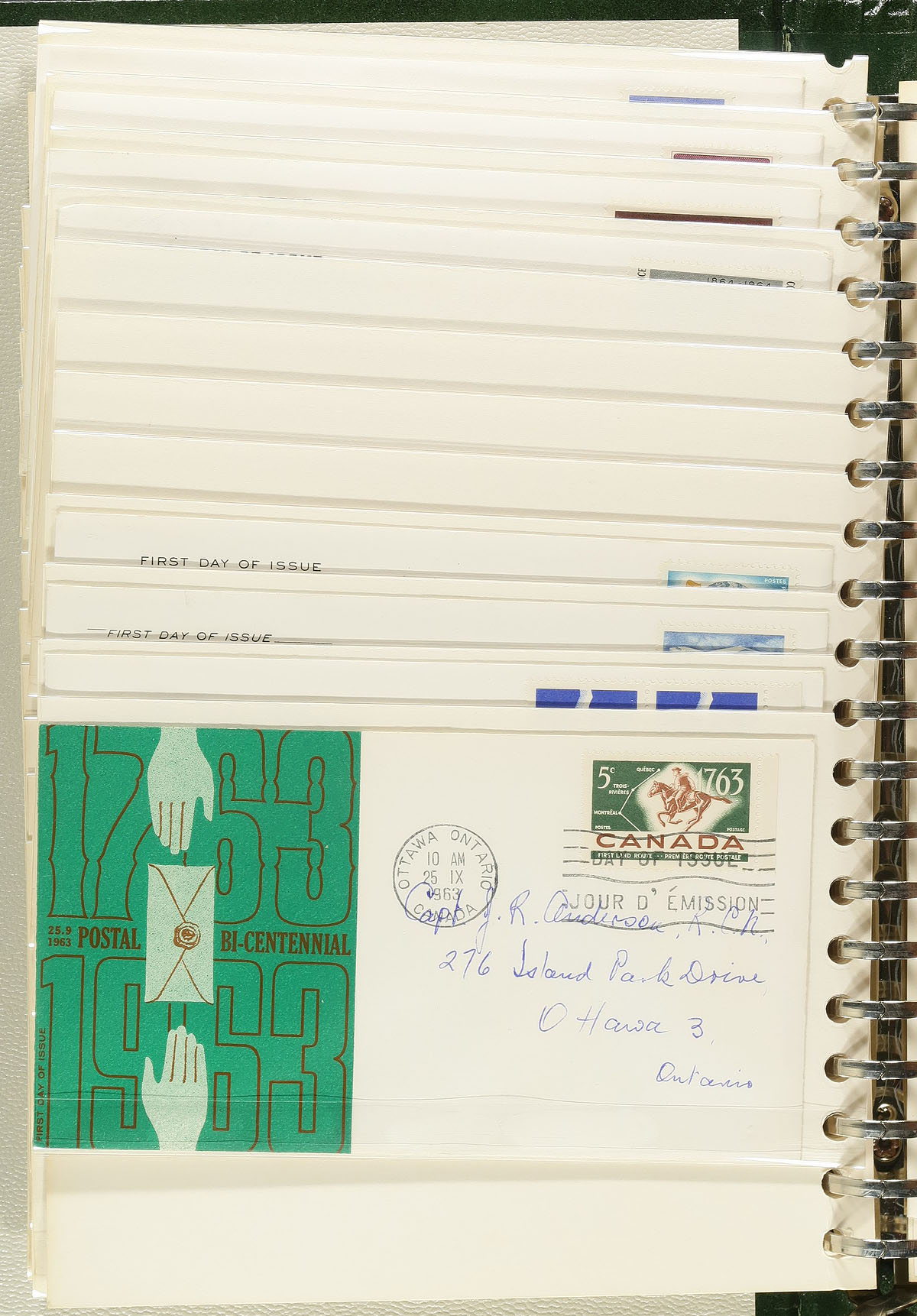 First Day Covers. A box of cover albums (x5) containing a collection of First Day Covers from the 1930's to 1980's. The bulk of the value is in three matching FDC albums (still in original boxes) with small format covers, being primarily private cachet covers (but also some non-cachet, and early small-format Canada Post issued), in which we noted a complete set of mid/high-value QEII Centennials. These three albums are complimented by a Unisafe FDC album with mostly Canada Post issued FDC and a small FDC album with Canada/ Foreign FDC. About 400 covers in total. Estimate =