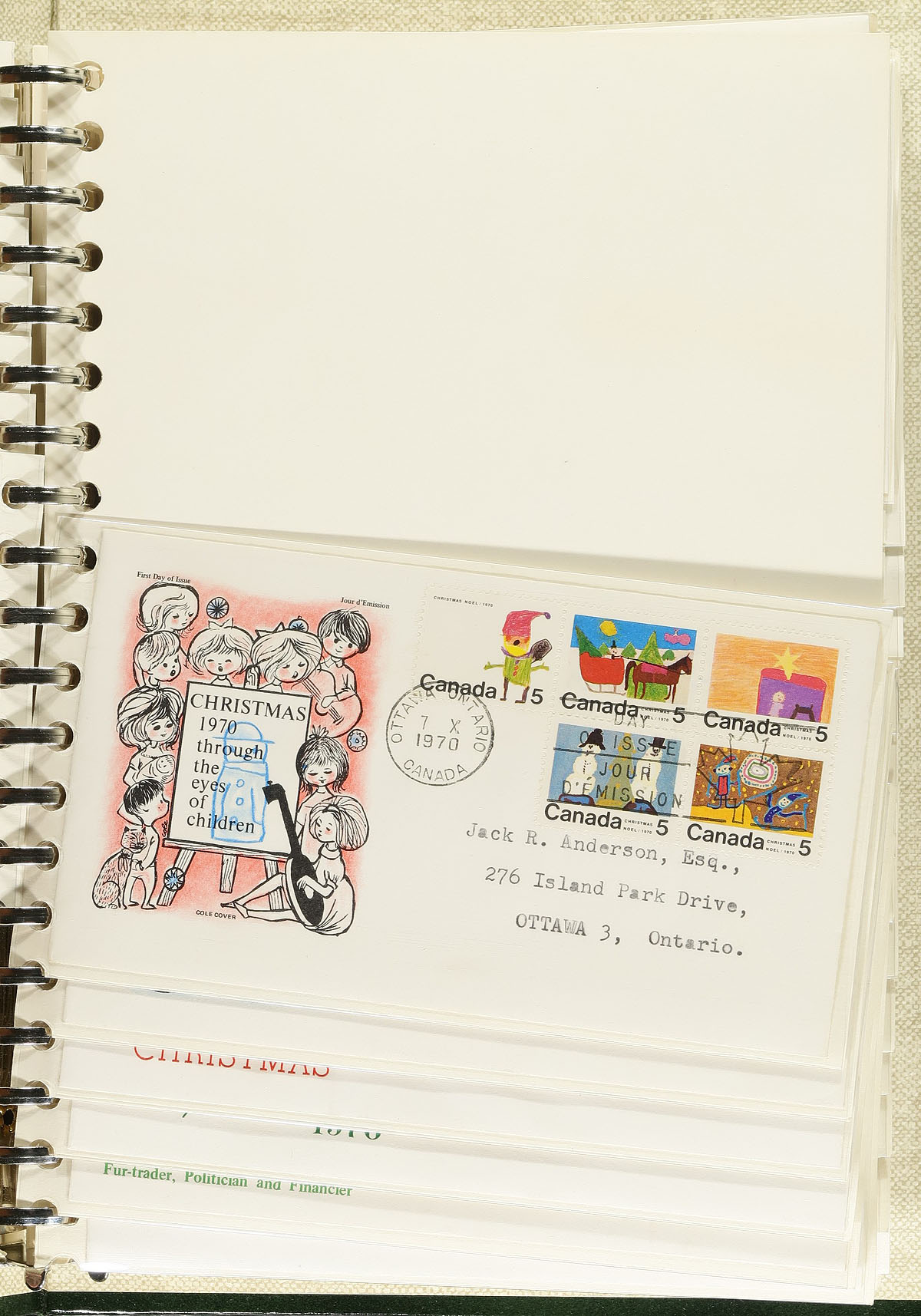 First Day Covers. A box of cover albums (x5) containing a collection of First Day Covers from the 1930's to 1980's. The bulk of the value is in three matching FDC albums (still in original boxes) with small format covers, being primarily private cachet covers (but also some non-cachet, and early small-format Canada Post issued), in which we noted a complete set of mid/high-value QEII Centennials. These three albums are complimented by a Unisafe FDC album with mostly Canada Post issued FDC and a small FDC album with Canada/ Foreign FDC. About 400 covers in total. Estimate =