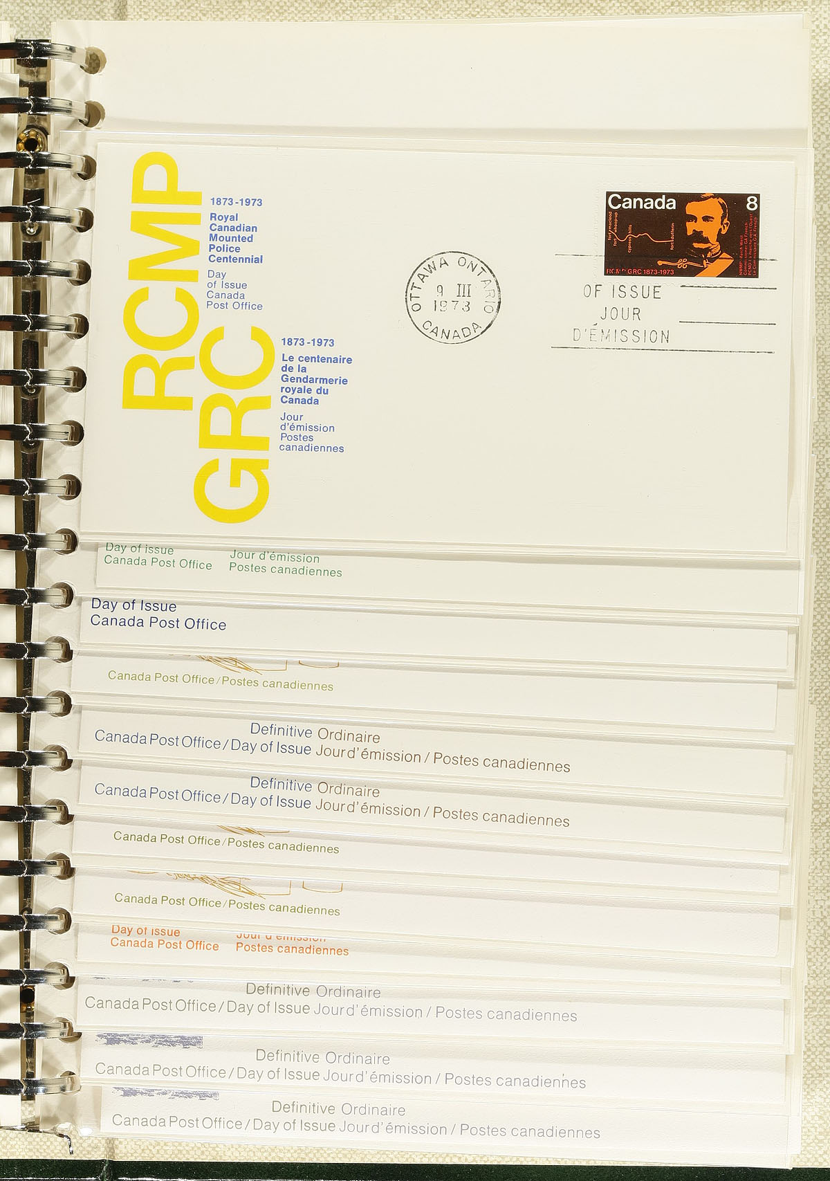 First Day Covers. A box of cover albums (x5) containing a collection of First Day Covers from the 1930's to 1980's. The bulk of the value is in three matching FDC albums (still in original boxes) with small format covers, being primarily private cachet covers (but also some non-cachet, and early small-format Canada Post issued), in which we noted a complete set of mid/high-value QEII Centennials. These three albums are complimented by a Unisafe FDC album with mostly Canada Post issued FDC and a small FDC album with Canada/ Foreign FDC. About 400 covers in total. Estimate =