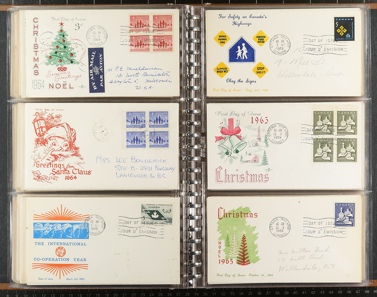 First Day Covers. An old-time FDC album, filled with 150 primarily private cachet FDC from the 1932-1977 period. Includes many better, with "back of the book" Airmails, 1932 Medallion, 1933 Royal William, 1934 Jacques Cartier, 1935 Silver Jubilee, George VI (various, including better 1946 Peace issue), early QEII and a set of the 1967 QEII Centennial mid/high-values. A bit of foxing on some of the 1950's issues, but overall a very useful offering. Estimate =