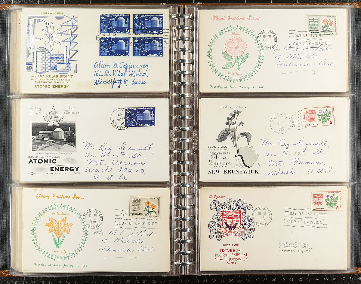 First Day Covers. An old-time FDC album, filled with 150 primarily private cachet FDC from the 1932-1977 period. Includes many better, with "back of the book" Airmails, 1932 Medallion, 1933 Royal William, 1934 Jacques Cartier, 1935 Silver Jubilee, George VI (various, including better 1946 Peace issue), early QEII and a set of the 1967 QEII Centennial mid/high-values. A bit of foxing on some of the 1950's issues, but overall a very useful offering. Estimate =