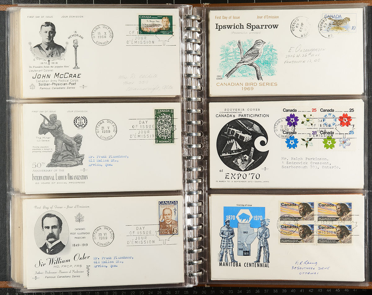 First Day Covers. An old-time FDC album, filled with 150 primarily private cachet FDC from the 1932-1977 period. Includes many better, with "back of the book" Airmails, 1932 Medallion, 1933 Royal William, 1934 Jacques Cartier, 1935 Silver Jubilee, George VI (various, including better 1946 Peace issue), early QEII and a set of the 1967 QEII Centennial mid/high-values. A bit of foxing on some of the 1950's issues, but overall a very useful offering. Estimate =