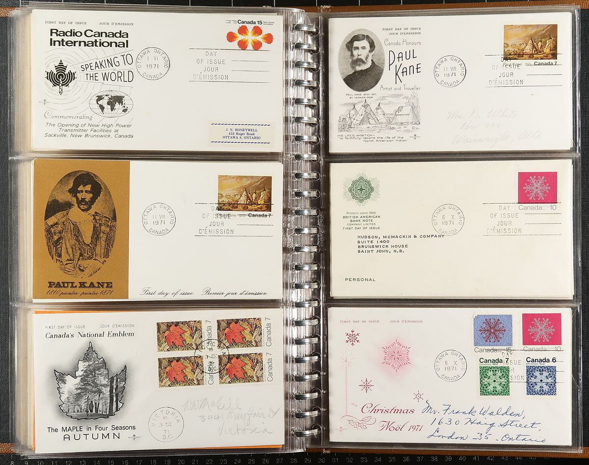 First Day Covers. An old-time FDC album, filled with 150 primarily private cachet FDC from the 1932-1977 period. Includes many better, with "back of the book" Airmails, 1932 Medallion, 1933 Royal William, 1934 Jacques Cartier, 1935 Silver Jubilee, George VI (various, including better 1946 Peace issue), early QEII and a set of the 1967 QEII Centennial mid/high-values. A bit of foxing on some of the 1950's issues, but overall a very useful offering. Estimate =