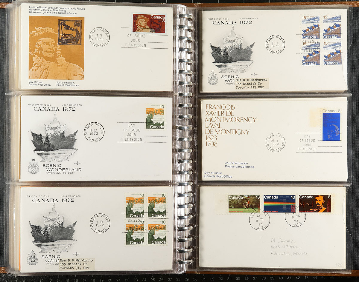 First Day Covers. An old-time FDC album, filled with 150 primarily private cachet FDC from the 1932-1977 period. Includes many better, with "back of the book" Airmails, 1932 Medallion, 1933 Royal William, 1934 Jacques Cartier, 1935 Silver Jubilee, George VI (various, including better 1946 Peace issue), early QEII and a set of the 1967 QEII Centennial mid/high-values. A bit of foxing on some of the 1950's issues, but overall a very useful offering. Estimate =