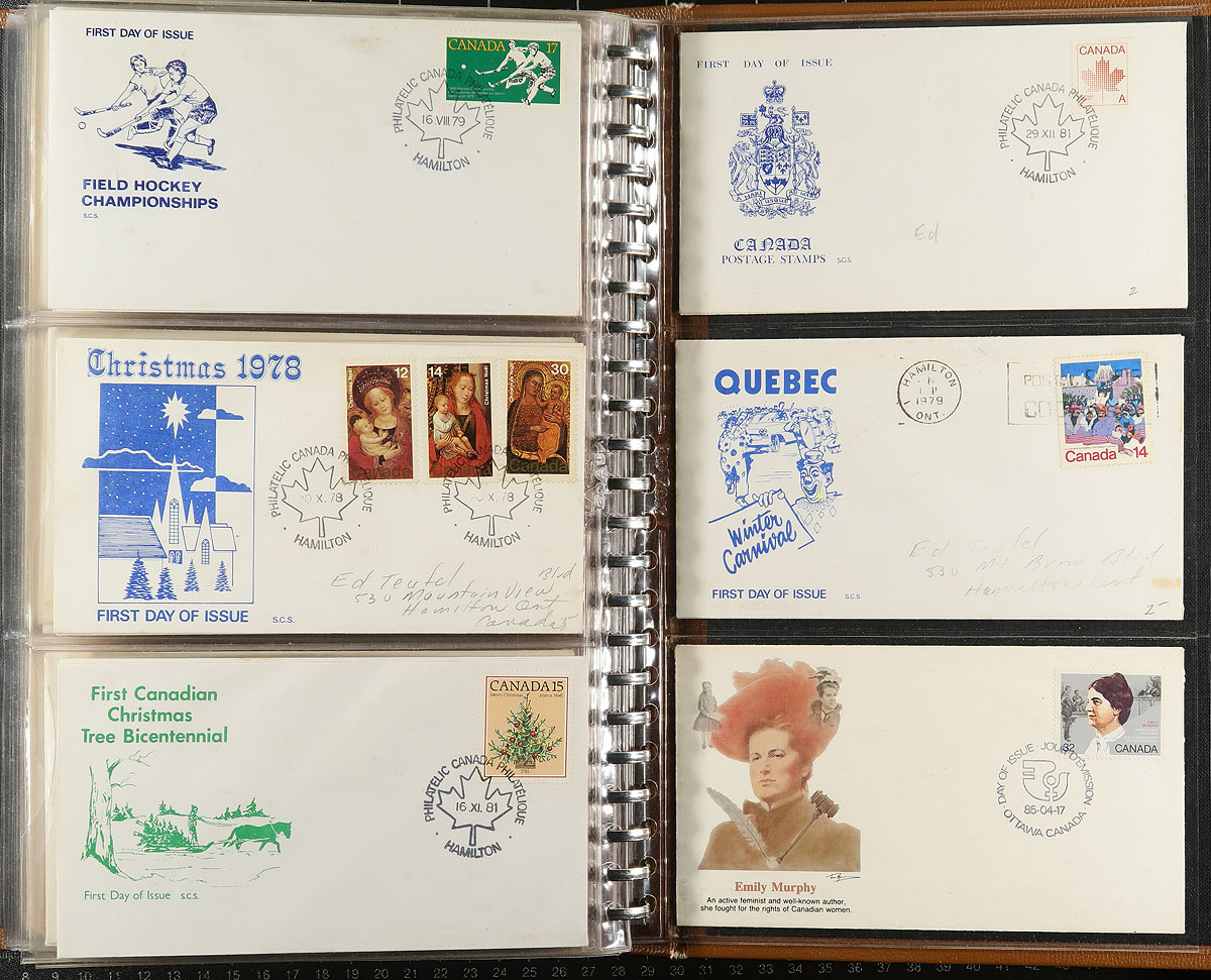 First Day Covers. An old-time FDC album, filled with 150 primarily private cachet FDC from the 1932-1977 period. Includes many better, with "back of the book" Airmails, 1932 Medallion, 1933 Royal William, 1934 Jacques Cartier, 1935 Silver Jubilee, George VI (various, including better 1946 Peace issue), early QEII and a set of the 1967 QEII Centennial mid/high-values. A bit of foxing on some of the 1950's issues, but overall a very useful offering. Estimate =