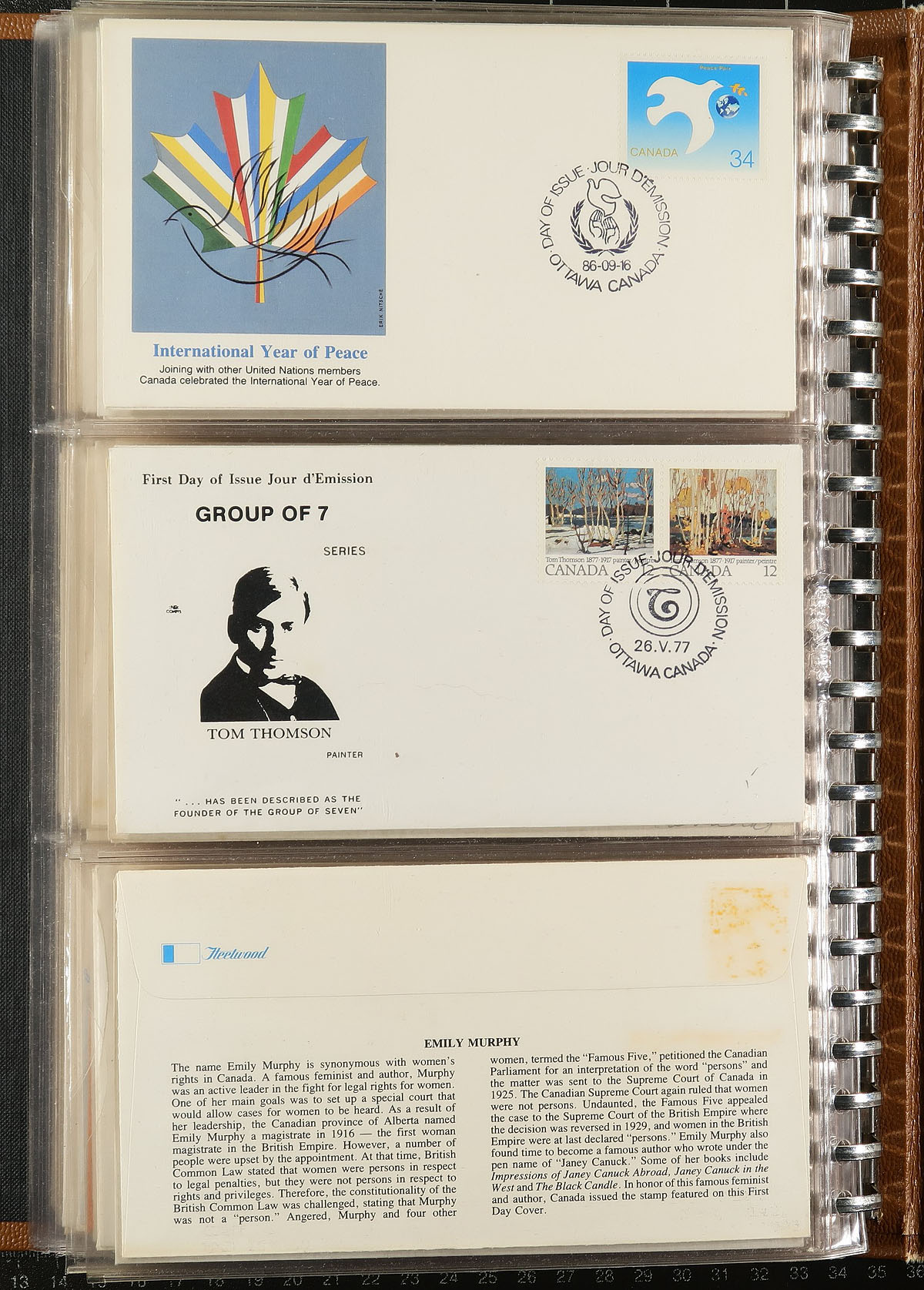 First Day Covers. An old-time FDC album, filled with 150 primarily private cachet FDC from the 1932-1977 period. Includes many better, with "back of the book" Airmails, 1932 Medallion, 1933 Royal William, 1934 Jacques Cartier, 1935 Silver Jubilee, George VI (various, including better 1946 Peace issue), early QEII and a set of the 1967 QEII Centennial mid/high-values. A bit of foxing on some of the 1950's issues, but overall a very useful offering. Estimate =